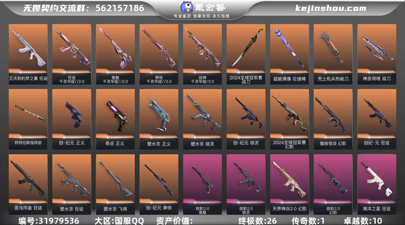 【套装】:2024全球冠军赛套装,千灵华绽//2.0套装,创·纪元套装,塑水宗套装,掠影//2.0套装【英雄】:幻棱,炼狱,维斯,暮蝶,钛狐,壹决,铁臂,捷风,雷兹,幽影,不死鸟,贤者,猎枭,蝰蛇,零,芮娜,奇乐,尚勃勒,霓虹,斯凯,夜露,星礈,K/O,海神,盖可,黑梦,钢锁【近战武器】:近战武器-2024全球冠军赛 战刀,近战武器-碎心裂刃,近战武器-流风回雪,近战武器-影钩,近战武器-黑波之刃,近战武器-镭切,近战武器-超能偶像 应援棒,近战武器-荒土机兵 热能刀,近战武器-神圣领域 战刀,近战武器-阿特拉斯指挥部 甩棍【狂徒】:狂徒-艾沃莉的梦之翼,狂徒-混沌序曲,狂徒-塑水宗,狂徒-创·纪元,狂徒-千灵华绽//2.0,狂徒-掠影,狂徒-海洋之星,狂徒-日冕雄师,狂徒-离子武器//2.0,狂徒-超能偶像,狂徒-海洋旅者,狂徒-荒土机兵【幻影】:幻影-2024全球冠军赛,幻影-黯夜怪谈,幻影-天界神兵//2.0,幻影-掠影//2.0,幻影-神圣领域,幻影-聚合之力,幻影-纳米打击,幻影-战术小伙伴【戍卫】:戍卫-超能偶像,戍卫-钢轨卫士,戍卫-逆冲蛮牛,戍卫-月球哨兵【獠犬】:獠犬-神圣领域,獠犬-采蜜小蜂队,獠犬-逆冲蛮牛【冥驹】:冥驹-堕天遗武,冥驹-荒土机兵,冥驹-星云暗涌【飞将】:飞将-塑水宗,飞将-聚合之力,飞将-光导纤维【莽侠】:莽侠-创·纪元,莽侠-千灵华绽//2.0,莽侠-月球哨兵【战神】:战神-千灵华绽//2.0,战神-神圣领域,战神-采蜜小蜂队【奥丁】:奥丁-掠影//2.0,奥丁-纳米打击,奥丁-战术小伙伴【判官】:判官-超能偶像,判官-采蜜小蜂队,判官-纳米打击x【雄鹿】:雄鹿-逆冲蛮牛,雄鹿-月球哨兵【骇灵】:骇灵-塑水宗,骇灵-创·纪元,骇灵-掠影//2.0,骇灵-荒土机兵,骇灵-光导纤维,骇灵-星云暗涌【蜂刺】:蜂刺-聚合之力,蜂刺-战术小伙伴,蜂刺-星云暗涌【标配】:标配-超能偶像...