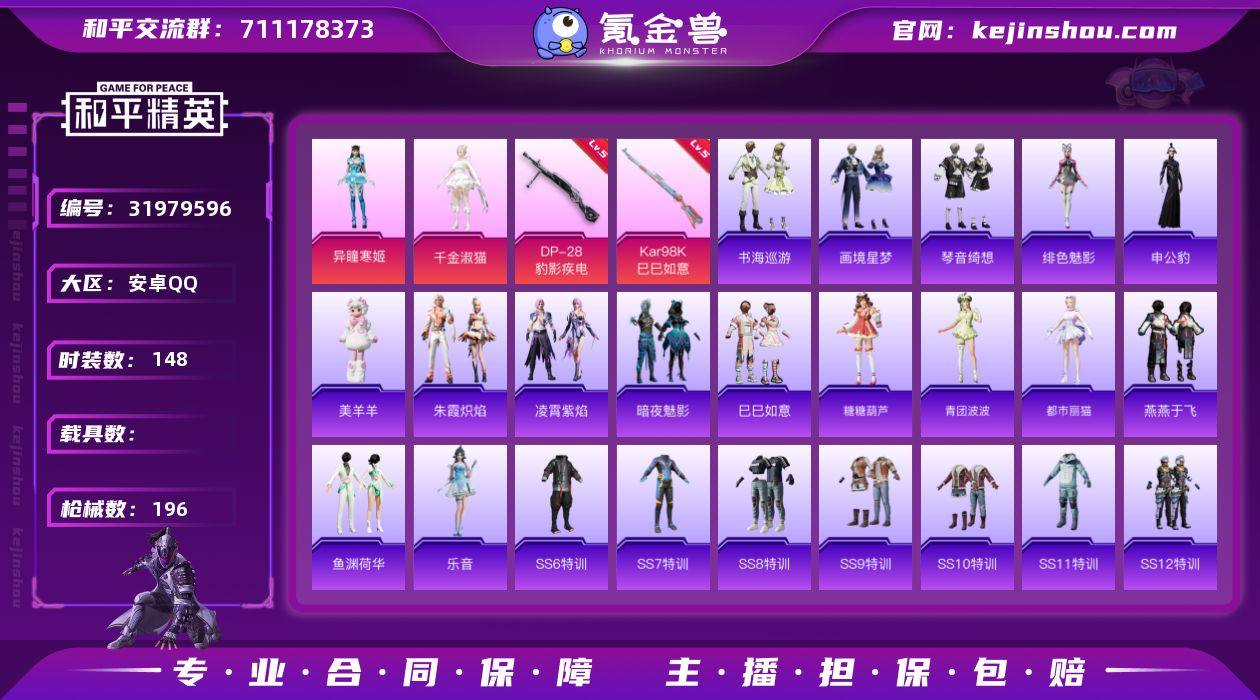 安卓 手Q-3粉装-4特效枪-0载具-2粉色飞行器-57080热力值-2王牌印记-148套装-196枪皮【粉色套装】:角色-千金淑猫,角色-异瞳寒姬,角色-虎痴许褚【粉色枪皮等级】:Kar98K-巳巳如意(五级),Mk14-福马献瑞(四级),M249-霁蓝缠春(七级),DP-28-豹影疾电(五级)【粉色枪皮】:Kar98K-巳巳如意,Mk14-福马献瑞,M249-霁蓝缠春,DP-28-豹影疾电【粉色飞行器】:炫彩糖果飞行器【粉色降落伞】:心之恋语降落伞,星之彼岸降落伞,暗夜玫瑰降落伞,海渊国主降落伞,炙焰牛王降落伞,环太平洋降落伞,暗夜鎏金降落伞,千金淑猫降落伞,喜羊羊与灰太狼降落伞,异瞳寒姬降落伞,炫彩糖果降落伞,霁蓝缠春降落伞,暮色玫影降落伞,虹云熊熊降落伞【稀有套装】:套装-巳巳如意,套装-雪国风尚,套装-糖糖葫芦,套装-青团波波,角色-都市丽猫,套装-燕燕于飞,套装-鱼渊荷华,角色-乐音,套装-朱霞炽焰,套装-凌霄紫焰,玩偶服-美羊羊,角色-申公豹,角色-绯色魅影,套装-书海巡游,套装-画境星梦,套装-琴音绮想,角色-馥郁金蕊,角色-碧青流霞,套装-红釉青花,角色-幽雨猫猫【稀有枪皮】:AKM-彩虹符号,AKM-灼热熔岩,AKM-破晓战魂,AKM-虎虎生威,AKM-霓虹街区,AKM-龙的传人,M16A4-幻世战舞者,M16A4-甜心亚梦,M16A4-红色方程式,M16A4-蓝色火焰,M16A4-千金淑猫,SCAR-L-红色方程式,M416-夜灯,M416-神秘黑猫,M416-糯团青竹,M416-红色方程式,M416-蓝色火焰,GROZA-彩虹符号,GROZA-懵萌河马,GROZA-田园牧歌,AUG-天降萌叽,AUG-耀粉歌者,M762-天降萌叽,M762-深海曼妙,M762-牛气冲天,M762-瑞龙福将,Mk47-妙红点点,G36C-懵萌河马,AC-VAL-天降萌叽,AC-VAL-快闪甜心,AC-VAL-甜心亚梦,蜜獾-天降萌叽,ACE32-画境星梦,ARX-凌霄紫焰,UZI-啾咪啾咪,UZI-炫彩节奏,UZI-红色方程式,UMP45-夜灯,UMP45-生命誓言...