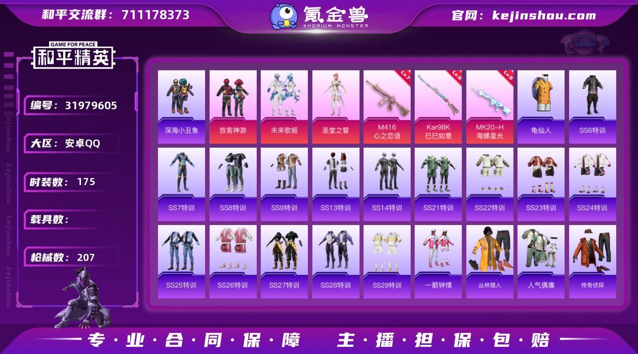 安卓 手Q-3粉装-4特效枪-0载具-0粉色飞行器-66003热力值-7王牌印记-175套装-207枪皮【热门品类】:套装-深海小丑鱼,套装-龟仙人【粉色套装】:粉装-放客神游,粉装-未来歌姬,角色-圣堂之誓【粉色枪皮等级】:M416-心之恋语(七级),Kar98K-巳巳如意(五级),Mk14-福马献瑞(五级),MK20-H-海螺星光(五级)【粉色枪皮】:M416-心之恋语,Kar98K-巳巳如意,Mk14-福马献瑞,MK20-H-海螺星光【粉色降落伞】:春暖花开降落伞,垂柳戏鸭降落伞,暗夜鎏金降落伞,镜光幻境降落伞,创世·救赎降落伞,无垠阁降落伞,镜花水月降落伞【稀有套装】:套装-龟仙人,套装-马上有钱【稀有枪皮】:AKM-夜灯,AKM-彩虹符号,AKM-破晓战魂,AKM-霓虹街区,AKM-龙的传人,M16A4-蓝色火焰,M16A4-龙虾霸霸,SCAR-L-炫彩节奏,SCAR-L-玉兔迎春,M416-夜灯,M416-糯团青竹,M416-蓝色火焰,GROZA-懵萌河马,GROZA-春暖花开,GROZA-治愈之星,GROZA-田园牧歌,GROZA-黑色刀锋,AUG-天降萌叽,AUG-怪笑疯兔,AUG-海螺星光,AUG-耀粉歌者,AUG-闲梦青缨,QBZ-彩虹符号,M762-天降萌叽,M762-彩虹符号,M762-拳皇97,M762-第五大道,M762-镭射皇者,Mk47-妙红点点,G36C-懵萌河马,AC-VAL-天降萌叽,AC-VAL-快闪甜心,AC-VAL-闲梦青缨,蜜獾-垂柳戏鸭,蜜獾-天降萌叽,蜜獾-娇憨猪猪,蜜獾-虎痴许褚,UZI-众神之王,UZI-啾咪啾咪,UZI-天降萌叽,UZI-娇憨猪猪,UMP45-夜灯,UMP45-生命誓言,UMP45-蓝色火焰,UMP45-极意拳锋,Vector-焰鹰斗篷,Vector-彩虹符号,Vector-治愈之星,Vector-田园牧歌,Vector-银河战甲,Vector-黑色刀锋,汤姆逊-勇闯险境,汤姆逊-天降萌叽,汤姆逊-炫彩节奏,MP5K-众神之王,P90-倾城蜜语,P90-快闪甜心,P90-飞驰魅影,P90-巳巳如意,Kar98K-勇闯险境,Kar98K-彩虹符号,Kar98K-影袭,Kar98K-红色方程式,M24-影...