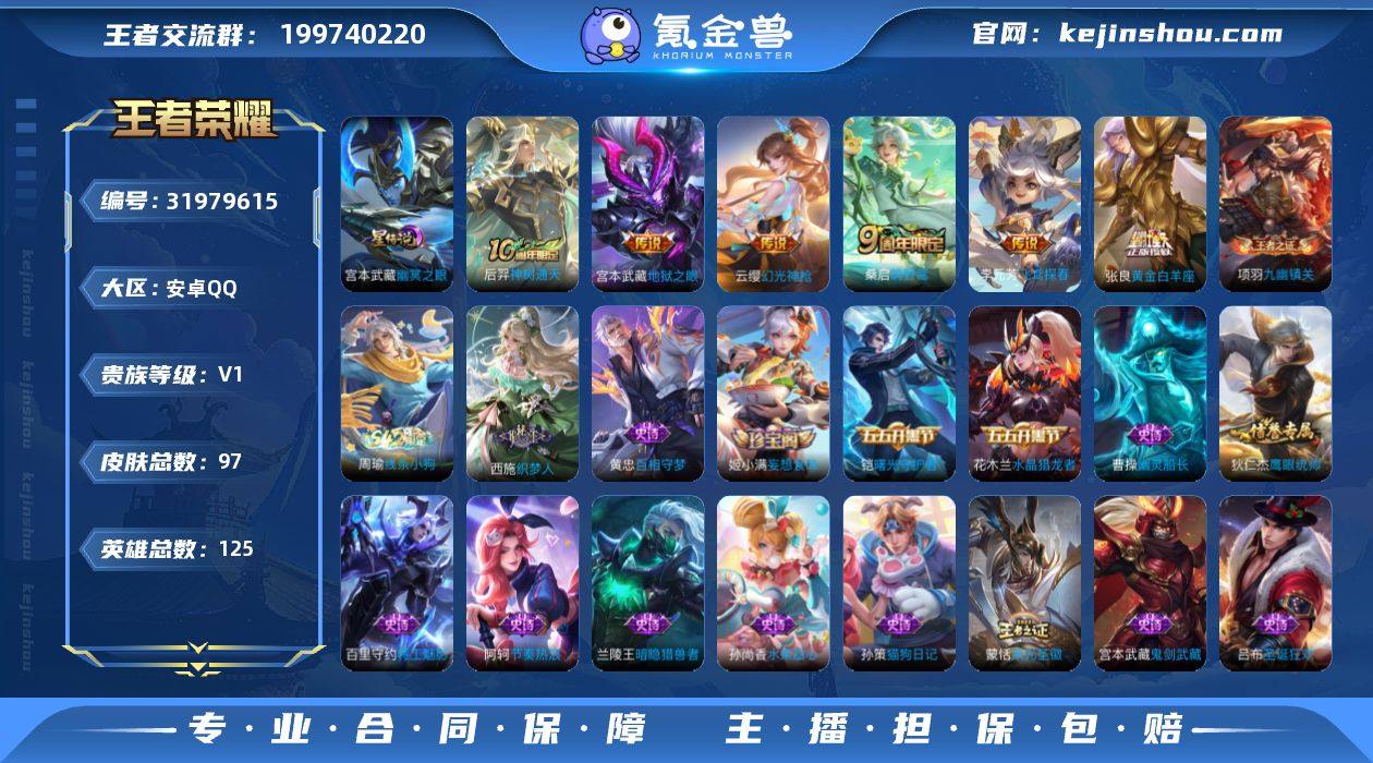 安卓Q-V0-最强王者段位-125英雄-97皮肤-6传说-23史诗【传说皮肤】:后羿神树通天,云缨幻光神枪,桑启鸣野蒿,李元芳飞鸢探春,张良黄金白羊座,宫本武藏地狱之眼【限定皮肤】:蒙犽顽岩魄,姜子牙天穹之誓,狄仁杰阴阳师,蒙恬荣光圣徽,鬼谷子天穹祈灯,姬小满妄想食味,周瑜熔金海岸【赛季限定】:鬼谷子天穹祈灯,姜子牙天穹之誓,东皇太一噬灭天穹,太乙真人谧流熔炉,钟馗虚灵犬护,甄姬逆浪荇歌,亚瑟荣光之誓,蒙恬荣光圣徽,项羽九幽镇关【战令限定】:周瑜线条小狗【史诗皮肤】:周瑜线条小狗,项羽九幽镇关,西施织梦人,黄忠百相守梦,蒙犽顽岩魄,姬小满妄想食味,蒙恬荣光圣徽,狄仁杰鹰眼统帅,孙策猫狗日记,阿轲节奏热浪,铠曙光守护者,百里守约特工魅影,兰陵王暗隐猎兽者,刘邦德古拉伯爵,花木兰水晶猎龙者,曹操幽灵船长,刘禅绅士熊喵,吕布圣诞狂欢,妲己魅力维加斯,嬴政摇滚巨星,嬴政暗夜贵公子,孙尚香水果甜心,宫本武藏鬼剑武藏,廉颇地狱岩魂【其他皮肤】:鲁班七号班班快跑,虞姬溯影追猎,蚩奼极光幻客,艾琳鹤鸣心笺,张良罗小黑战记,亚瑟荣光之誓,哪吒罗小黑战记,鬼谷子克喵,莱西奥踏浪烽翎,庄周锦麟游梦,云中君云械蓝图,甄姬逆浪荇歌,白起死霸装,姬小满小满鸭,露娜命运加冕,阿古朵布丁狗之约,张良灵野札记,苏烈春野闲踪,钟馗虚灵犬护,刘备浪漫序章,戈娅玫蓝誓约,姜子牙星梦巡礼,西施雪境奇遇,典韦铁骨偃魂,太乙真人谧流熔炉,苍苍林狼骑,东皇太一噬灭天穹,周瑜熔金海岸,姜子牙天穹之誓,大司命暗都幽影,钟无艳春野之旅,鬼谷子天穹祈灯,亚连破局者,程咬金无双福将,鲁班大师乓乓大师,刘禅秘密基地,孙膑归虚梦演,小乔丁香结,狂铁命运角斗场,关羽龙腾万里,狄仁杰阴阳师,甄姬花好人间,达摩拳王,亚瑟死亡骑士,典韦黄金武士,妲己少女阿狸,...