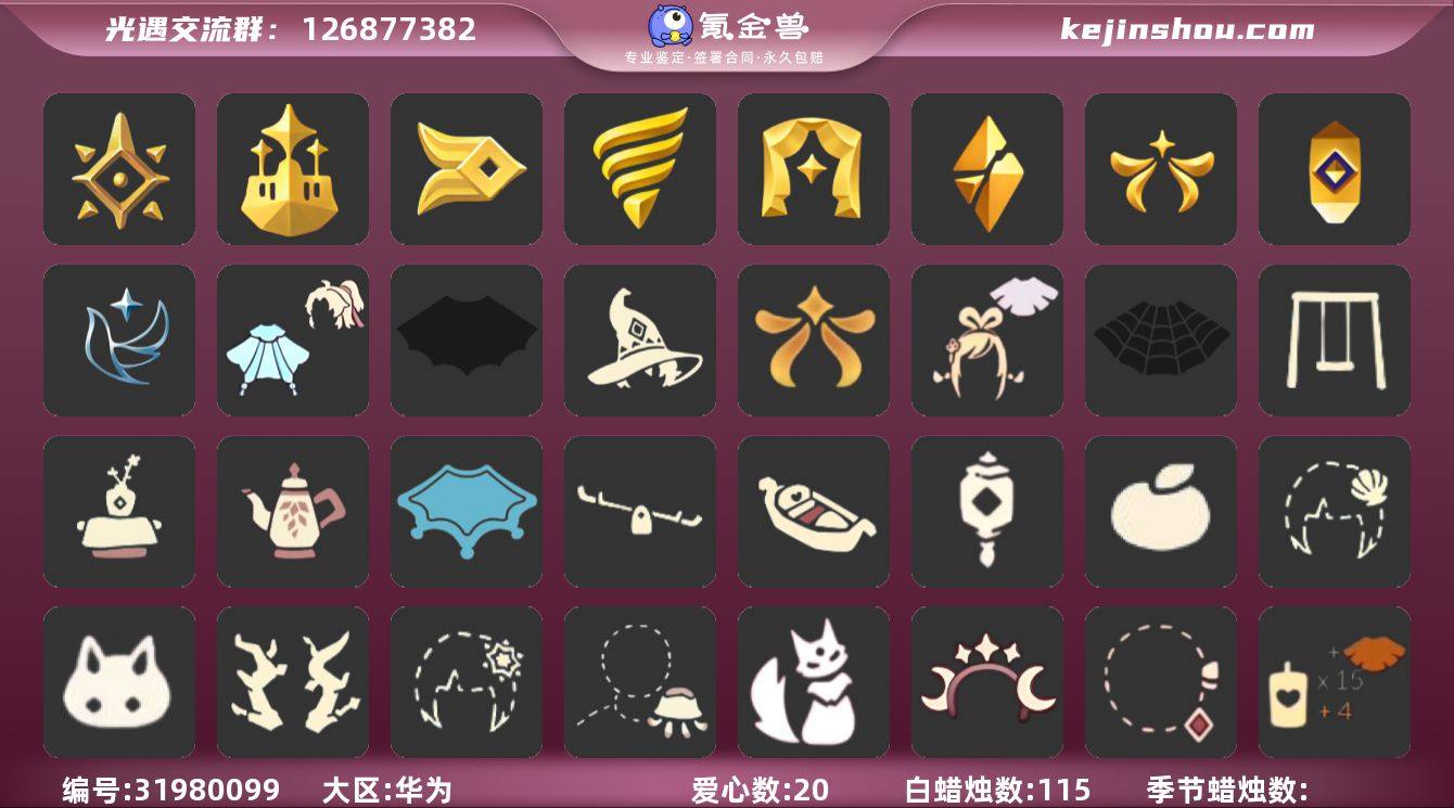账号类型: 手机账号 季节已毕业: 小王子季,风行季,潜海季,表演季,破晓季,欧若拉季,夜行季,追忆季,拾光季,归巢季,九色鹿季 完成地图: 晨岛,云野,雨林,霞谷,暮土,禁阁 珍稀物品: 白枭,透明蝶翼斗,玫瑰花,彩虹围巾 礼包: 蝙蝠套,巫师,欧若拉之翼,九色鹿角,音乐桌,绊爱,大铁头,鹿角,蜘蛛斗,牛仔裤,秋千,茶桌,白绒金,瑞雪,福娃,跷跷板,吉他,灯笼,致爱装扮,人声乐器,奔跑发型,彩虹帽,橘子,贝壳,黄伞,红伞,兔子,枯角,雪花,水母,猫套,猫背饰,星月头饰,彩虹耳钉,彩虹耳机,蝴蝶结,四叶草,暗彩装扮,透明蛛丝,新年耳钉,创始人,海龟斗篷,奉献斗篷 裤子: 武士裤,背带裤,搓澡巾,王子服,蓝绿裤,飞天裤 面具: 呼吸面具,夜行毕业面具,黄眉企鹅面具 面饰: 红耳机,黑框眼镜 项链: 围巾 发型: 归巢毕业发型,若笠,虚荣,单侧绑发,小王子发型,留辫蘑菇头,飞天盘发 头饰: 羽毛发饰,牛仔帽,蓝色音乐会,平顶帽 斗篷: 海洋斗,绿芽,粉红绒毛斗篷,遥鲲斗篷,燕尾斗篷,冥龙斗篷,奉献斗篷 配饰: 雨伞,高音钢琴,相机,玫瑰花,鲲灯 亮点: 【优质装备】:表演季,白枭(帝企鹅发),武士裤,小王子季(王子季),风行季,潜海季,破晓季,透明蝶翼斗,欧若拉季(欧若拉),归巢毕业发型(五塑彩羽发),羽毛发饰(多羽发饰),高音钢琴(白色高脚钢琴),玫瑰花,夜行季,追忆季,牛仔帽(西部帽),相机(季卡相机),拾光季,彩虹围巾(五塑彩带斗),归巢季,九色鹿(九色鹿季),王子服(小王子套装),蓝绿裤(高领舞服),飞天裤(柔缎花边连)(九色鹿丝带裤),围巾(肩带),蝙蝠套(蝙蝠斗篷)(南瓜头),欧若拉之翼,音乐桌(网易云留声机),绊爱(绊爱斗篷)(绊爱礼包),秋千(情人秋千),茶桌(花憩茶桌),红耳机,九色鹿角(神鹿祝福头饰)(神鹿祝福礼包),大铁头,鹿角(圣诞鹿角),蜘蛛斗(蛛丝斗篷)(蛛网斗篷),巫师(巫师帽),牛仔裤(阔腿牛仔),晨岛,云野,雨林,霞谷,墓土(暮土),禁阁,若笠(箬笠),呼吸面具(潜水面具),夜行...