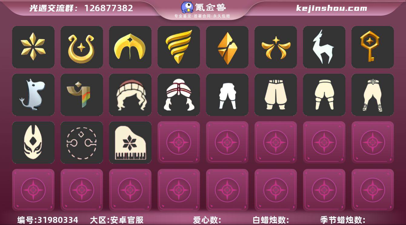账号类型: 手机账号 季节已毕业: 预言季,梦想季,小王子季,风行季,潜海季,表演季,破晓季,欧若拉季,集结季,夜行季,追忆季,拾光季,归巢季,九色鹿季,筑巢季,二重奏季,姆明季,彩染季,青鸟季,双星季,迁徙季 珍稀物品: 阿努比斯(狗头),白枭,透明蝶翼斗,周年电吉他,玫瑰花 礼包: 蝙蝠套,巫师,围巾,星球斗,小狐狸,欧若拉之翼,九色鹿角,大耳狗抱枕,大耳狗装扮,大耳狗服饰,绊爱,鹿角,荷叶伞,蜘蛛斗,牛仔裤,兔子鞋,大耳狗发饰,肯德基联动,运动鞋,秋千,茶桌,茶壶,餐桌,白绒金,瑞雪,女巫裙,福娃,跷跷板,小船,吉他,灯笼,奔跑裤子,致爱装扮,人声乐器,奔跑发型,鲤鱼套,彩虹帽,雪花球,绒帽,橘子,贝壳,黄伞,红伞,兔子,南瓜,枯角,雪花,鲤鱼,电吉他,水母,猫套,猫背饰,星月头饰,彩虹耳钉,彩虹耳机,雪怪斗,新年裤,蝴蝶结,魔法棒,奥利奥,海螺,四叶草,暗彩装扮,向日葵套,小提琴,拖鞋,滑板,爱心眼镜,火焰眼镜,透明蛛丝,伯爵面具,飞蛾套,雪人鞋,夹袄斗,新年耳钉,龙纹斗,创始人,海蓝波浪发型,飞鸟纸伞,日光耳环,满月耳坠,月华套装,线框斗,优雅三件套,姆明饰品套装,史力奇套装,史力奇帽子,树精肩饰,恶作剧飞行扫帚,恶作剧鸦羽斗篷,向日葵连衣裙,蛛网朋克,龙鳞束身长袍,仙境茶会门扉礼包,爱丽丝围裙套装礼包,进行曲制服,妮妮斗篷,海龟斗篷,园丁装扮,衔福献瑞礼包,献瑞折扇礼包,渐变双马尾发型礼包,心心相印发饰礼包,小狗周年发饰,篝火点心礼包,奉献斗篷,风之旅人白袍,潮汐套装礼包,粽子发饰礼包,必胜客联动装扮礼包,必胜客联动分享披萨背饰礼包,青衫落拓礼包,周年影院套餐礼包,线框斗篷礼包,缤纷飘带斗篷礼包,小黄鸭雨衣套装礼包,小黄鸭发饰礼包,蝴蝶与花发饰礼包,小海牛配饰礼包,海牛玩偶礼包,活力海牛礼包,冥龙套装礼包,周年燕尾服斗篷,周年礼包,鹊桥相会套装,记忆水晶礼包,日光水母套装礼包,纤云弄巧礼包,鸦羽兜帽礼包,皮皮猫套装礼包 裤子:...