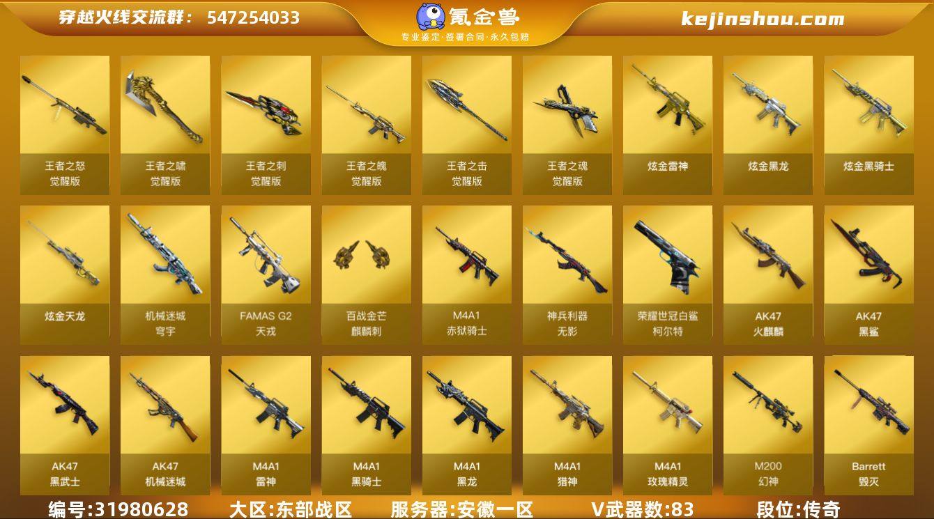安徽一区-94V-13王者武器数-4炫金武器数 【热门武器】:QBZ03-金色蔷薇,Scar Light-白虎,M200-幻神,柯尔特-荣耀世冠白鲨2023*2,M200-竞技荣光,死亡之眼,柯尔特-冠军之特,Kar98K-星神,M4A1-黑骑士,汤姆逊-烈龙*6,RPK-盘龙,加特林-炼狱*2,火麒麟-绝迹,USP-雷暴,沙鹰-修罗*5,荣耀世冠-龙啸 【王者炫金武器】:炫金骑士,炫金黑龙,炫金雷神,炫金天龙 【音效卡】:M4A1-黑骑士音效卡,Barrett-毁灭音效卡 【皮肤】:幻神-丹凤,幻神-荣耀世冠白鲨2023 皮肤,幻神-荣耀世冠EP 皮肤,ScarLight-白虎-冠军之虎皮肤,星神-CFS2025 皮肤,雷神-暗月,雷神-能量核心,雷神-荣耀之魄,雷神-烈虎皮肤,雷神-神秘按键 皮肤,火麒麟-冠军之心,火麒麟-平天大圣,火麒麟-心动糖果,毁灭-暗月,毁灭耀金皮肤,毁灭-CFS2020,毁灭-风暴,毁灭-直播专属,M4A1-千变-孔明皮肤,黑骑士耀金皮肤,黑骑士-AG-S4冠军典藏,无影-暗月,战神-粉色甜心皮肤*2,战神-紫绶金章皮肤*7,战神-流金岁月皮肤*3,AK47-B-常胜将军-曹操*3,AK47-B-常胜将军-刘备*2,AWM-天龙-传奇白鲨,修罗-能量核心,天神-暗月,轻型军用手斧-再燃火线 【角色】:葵,魅影,电竞教官-云悠悠,零·纪元,王者春,修道士,葵-阿尔法武装,暗夜-X,初恋灵狐,嘉年华灵狐,灵狐者-X,龙儿-小淘气,麻雀,女主播,潘多拉-X,潜龙队-X,莎莎,斯沃特-X,蜀雪,铁骑荣耀,樱-战斗天使 【人偶武器】:火麒麟-绝迹,AWM-灵狐-15周年嘉年华,M37-葵,COP-旗袍,夺魂,闪光弹-小乔,闪光弹-貂蝉,高爆手雷-大乔,迷你超能女侍,灵狐娃娃手雷*2 【暴走生化】:死亡之眼 【挑战大师】:冰龙粉碎者-白马银枪,激光毁灭者III*2 【英雄级武器】:AK47-火麒麟*2,M4A1-黑龙,M4A1-雷神,M4A1-黑骑士,AK47-黑武士,AK47-机械迷城,AK47-黑鲨,Scar Light-白虎,QBZ03-...