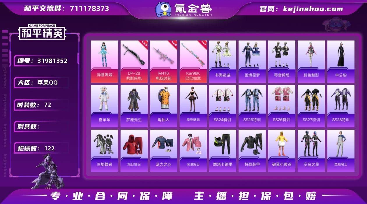无二次苹果 手Q-2粉装-7特效枪-0载具-1粉色飞行器-33633热力值-5王牌印记-72套装-122枪皮LK263211 【热门品类】:套装-龟仙人 【粉色套装】:角色-异瞳寒姬,角色-镜中幻 【粉色枪皮等级】:M416-电玩时刻(五级),UMP45-萌骑冒险(二级),AKS-74U-森灵之息(五级),Kar98K-巳巳如意(一级),Mk14-福马献瑞(五级),AA12-G-萌骑幻想(一级),DP-28-豹影疾电(五级) 【粉色枪皮】:M416-电玩时刻,UMP45-萌骑冒险,AKS-74U-森灵之息,Kar98K-巳巳如意,Mk14-福马献瑞,AA12-G-萌骑幻想,DP-28-豹影疾电 【粉色飞行器】:炫彩糖果飞行器 【粉色降落伞】:恐龙拽拽降落伞,莲影清波降落伞,光之祷告降落伞,千金淑猫降落伞,炫彩糖果降落伞,罪夜之冕降落伞,精灵菇菇降落伞 【稀有套装】:套装-龟仙人,套装-雪国风尚,套装-炫彩糖果,套装-马上有钱,角色-摩登魅猫,玩偶服-喜羊羊,角色-申公豹,角色-绯色魅影,套装-书海巡游,套装-画境星梦,套装-琴音绮想,套装-雨过天青,套装-红釉青花,角色-曹焱兵 【稀有枪皮】:AUG-冰晶雪宝,AKM-彩虹符号,AKM-破晓战魂,AKM-龙的传人,M16A4-绒绒猫尾,SCAR-L-夜灯,SCAR-L-炫彩节奏,SCAR-L-红色方程式,M416-糯团青竹,M416-红色方程式,M416-蓝色火焰,AUG-怪笑疯兔,AUG-耀粉歌者,QBZ-彩虹符号,M762-天降萌叽,M762-绯红前夜,AC-VAL-快闪甜心,蜜獾-天降萌叽,ACE32-画境星梦,UZI-啾咪啾咪,UMP45-生命誓言,UMP45-蓝色火焰,Vector-焰鹰斗篷,Vector-彩虹符号,Vector-生命誓言,汤姆逊-天降萌叽,汤姆逊-绒绒猫尾,MP5K-画境星梦,P90-快闪甜心,AWM-焰鹰斗篷,AWM-恐龙拽拽,VSS-彩虹符号,Mini14-穿刺龙虾,M417-惊鸿侠骨,MK20-H-快闪甜心,M200-惊鸿侠骨,M200-祥瑞锦鲤,M1加兰德-画境星梦,S686-千金淑猫,S12K-玩趣呆呆,S12K-极意拳锋,DBS-焰鹰斗篷,AA12-...