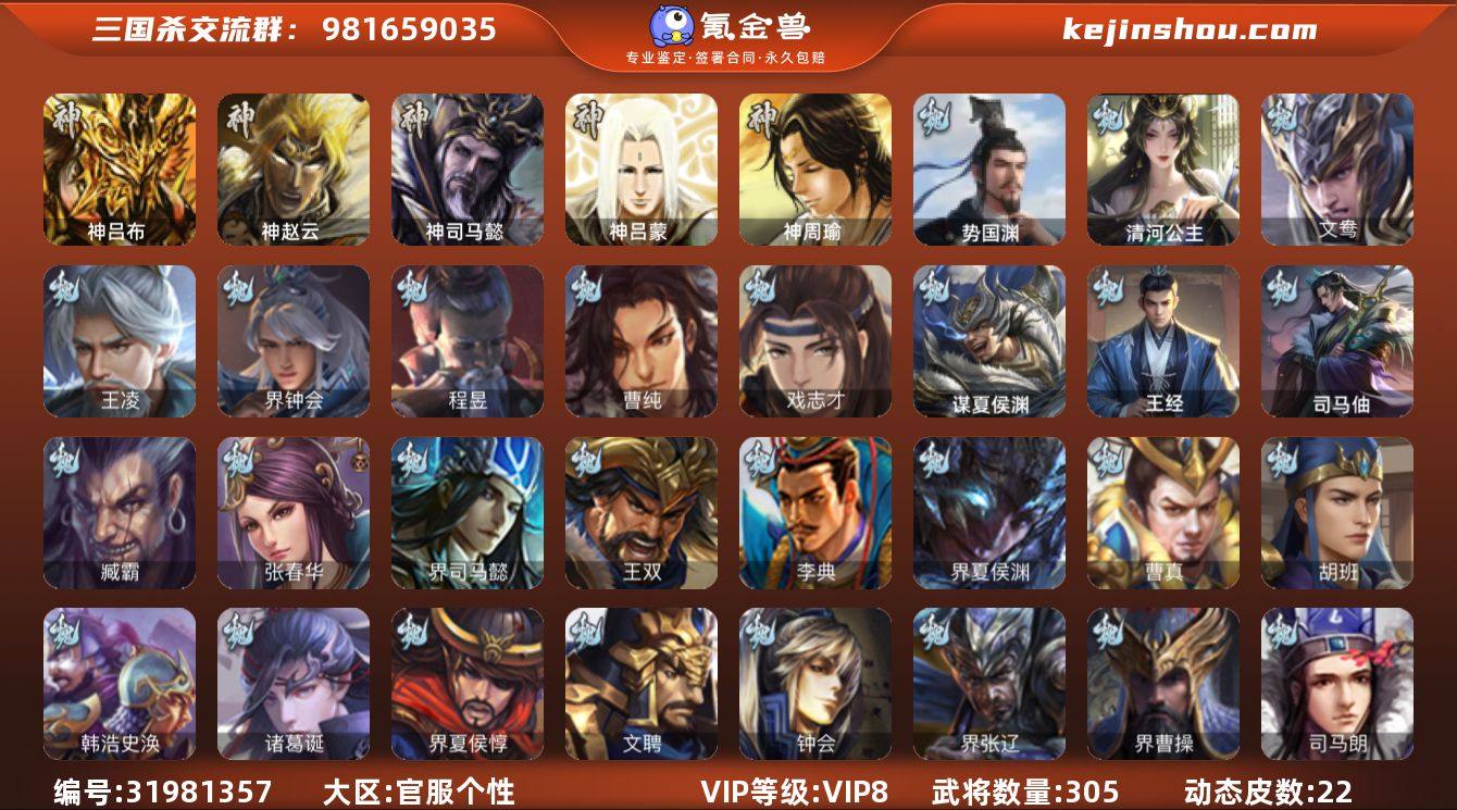 【14789339】官阶:骠骑将军;VIP等级:VIP8;史诗武将数量:23;动态皮肤数量:22;武将总数:305;史诗宝珠数量:15;将魂数量:6505;神将:3;魏国史诗武将:10;蜀国史诗武将:4;吴国史诗武将:4;群史诗武将:7