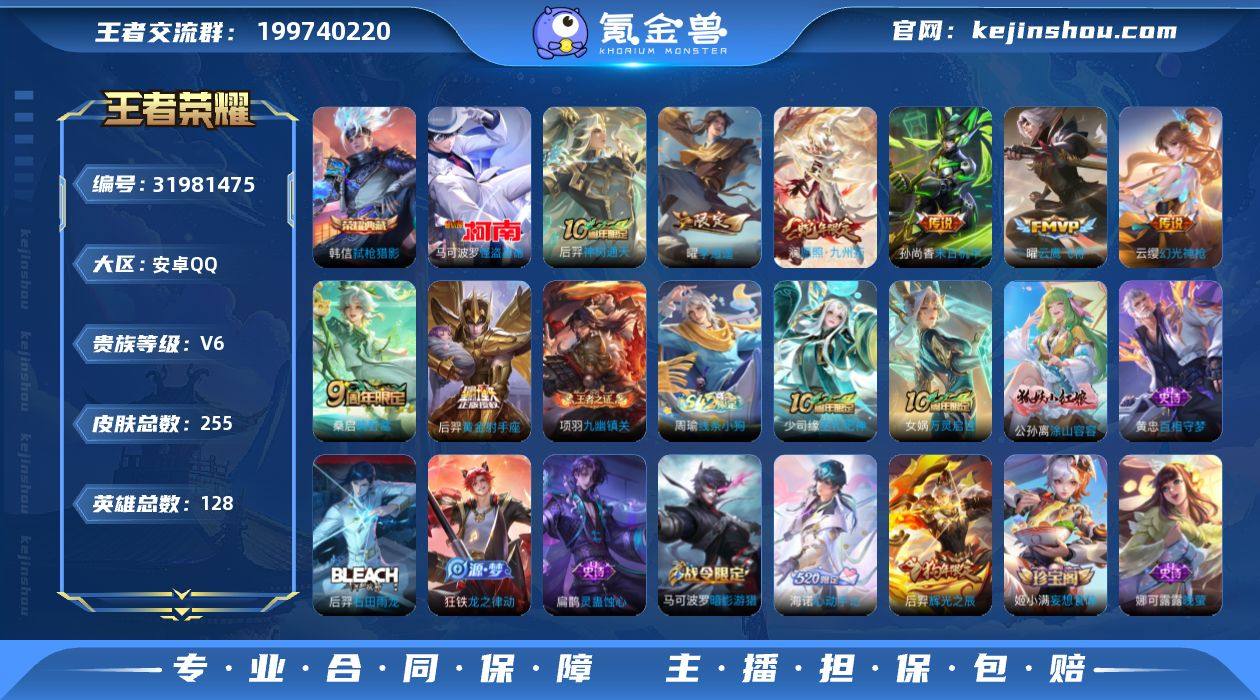 无二次安卓Q-V6-永恒钻石I段位-128英雄-255皮肤-1典藏皮肤-1珍品传说-8传说-75史诗 【英雄全皮】:孙权全皮,影全皮 【荣耀典藏】:韩信弑枪猎影 【珍品传说】:马可波罗怪盗基德 【传说皮肤】:后羿神树通天,澜愿照九州拓,云缨幻光神枪,桑启鸣野蒿,曜李逍遥 ,曜云鹰飞将,后羿黄金射手座,孙尚香末日机甲 【限定皮肤】:蒙犽顽岩魄,姜子牙天穹之誓,狄仁杰阴阳师,赵云皇家上将,嬴政优雅恋人,孙尚香蔷薇恋人,庄周高山流水,芈月重明,夏侯惇朔风刀,甄姬游园惊梦,马可波罗暗影游猎,狄仁杰魔术师,狄仁杰万华元夜,达摩沙漠行僧,项羽海滩派对,老夫子醍醐杖,程咬金演武夺筹,兰陵王金庭之子,牛魔御旌,后羿辉光之辰,李元芳云中旅人,钟馗驱傩正仪,雅典娜黎明之约,鬼谷子原初探秘者,鬼谷子五谷丰年,苏烈千军破阵,百里玄策原初追逐者,弈星混沌棋,梦奇顽趣,沈梦溪大漠名商,明世隐疑决卦,裴擒虎李小龙,裴擒虎擒涛扼浪,米莱狄御霄,云中君纤云弄巧,盾山御銮,猪八戒西部大镖客,上官婉儿梁祝,曜李逍遥 ,鲁班大师探海日志,桑启海盐诗旅,艾琳女武神,阿古朵江河有灵,张良古海寻踪,蒙恬荣光圣徽,高渐离燃音魔法,鬼谷子天穹祈灯,姬小满妄想食味,沈梦溪龙舞盛年,刘邦剑破天穹,程咬金群星魔术团,海诺心动手记,周瑜熔金海岸 【年限皮肤】:后羿辉光之辰,澜愿照九州拓 【赛季限定】:芈月重明,米莱狄御霄,牛魔御旌,盾山御銮,夏侯惇朔风刀,弈星混沌棋,明世隐疑决卦,老夫子醍醐杖,鬼谷子原初探秘者,狄仁杰万华元夜,程咬金演武夺筹,钟馗驱傩正仪,苏烈千军破阵,达摩沙漠行僧,兰陵王金庭之子,沈梦溪大漠名商,李元芳云中旅人,桑启海盐诗旅,裴擒虎擒涛扼浪,鲁班大师探海日志,张良古海寻踪,鬼谷子天穹祈灯,刘邦剑破天穹,姜子牙天穹之誓,东皇太一噬灭天穹,太乙真人...