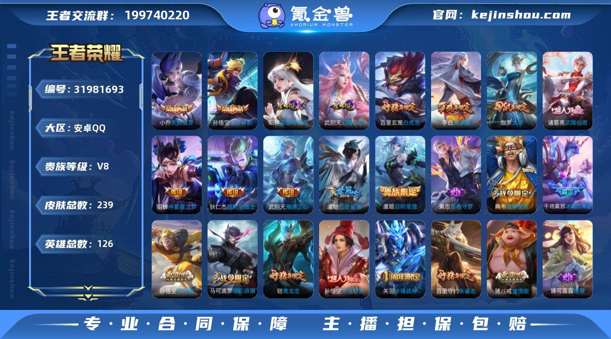 贵族8/皮肤239/典藏2/传说9/史诗61/英雄126/猪八戒全皮/武则天/全息碎影/天鹅之梦/幻海之心/金色仲夏夜/启明星使/太华/云霓雀翎/白虎志/武陵仙君/仲夏夜之梦/凤求凰/海洋之心/超时空战士-狄仁杰/狰(s8)/天穹之誓(s36)/阴阳师/皇家上将/蔷薇恋人/狮舞东方/蜃楼王(s4)/云端筑梦师/高山流水/迷踪丽影/超时空战士-钟无艳/妖精王(s5)/重明(s11)/猎兽之王/赤莲之焰/朔风刀(s17)/游园惊梦/落雪兰心/烛龙(s10)/穷奇(s12)/蓝屏警告/暗影游猎/魔术师/万华元夜(s22)/沙漠行僧(s26)/海滩派对/醍醐杖(s20)/冰锋战神/魔法小厨娘/演武夺筹(s23)/一生所爱/夺宝奇兵/驯魔猎人/金庭之子(s27)/瑞麟志/大圣娶亲/孙行者/御旌(s15)/银河之约/云中旅人(s29)/神迹守卫-钟馗/驱傩正仪(s24)/遇见飞天/朔望之晖/逐梦之翼/冰霜恋舞曲/单词大作战/繁星吟游/逐梦之光/原初探秘者(s21)/五谷丰年/青龙志/玄武志/千军破阵(s25)/朱雀志/混沌棋(s18)/星空之诺/大漠名商(s28)/疑决卦(s19)/李小龙/御狮(s13)/御霄(s14)/纤云弄巧/御銮(s16)/西部大镖客-猪八戒/猪悟能/梁祝/狂想玩偶喵/古海寻踪(s33)/熔金海岸/逆浪荇歌/百相守梦-黄忠/时之奇旅-安琪拉/时之恋人-孙尚香/魅语/晚萤/鹰眼统帅/功夫厨神/曙光守护者/特工魅影/冰冠公主/心灵战警/黄金分割率/水晶猎龙者/乱世虎臣/末日机甲-吕布/金属风暴/龙骑士/女仆咖啡/魅力维加斯/摇滚巨星/暗夜贵公子/水果甜心/地狱岩魂/偶像歌手/冰雪圆舞曲/圣诞恋歌/暗夜猫娘/电玩小子/克喵/踏浪烽翎/功夫炙烤/潮玩探月行/危途狂花/无双福将/紫罗兰之誓/铁甲之心/乓乓大师/缤纷绘卷/瓷语鉴心/秘密基地/无尽征程/圆桌骑士(盾山)/黑桃队长/次元突破/炽热元素使/鲨炮海盗猫/归虚梦演-蒙犽/神迹守卫/野性能量/丁香结/奇妙博物学/幽兰居士/虹云星官/科学大爆炸/守护之力/如懿/幻乐之宴/敏锐之力/掌控之力/制霸全明星/功夫老勺...