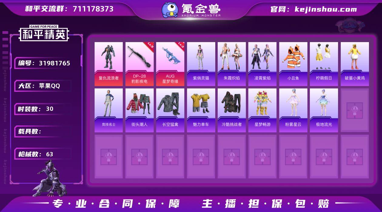 不可二次 苹果 手Q-1粉装-6特效枪-0载具-1粉色飞行器-16166热力值-1王牌印记-30套装-63枪皮 QW263216 【热门品类】:套装-小丑鱼 【粉色套装】:角色-复仇流浪者 【粉色枪皮等级】:AUG-星梦奇缘(三级),ACE32-萌骑漫游(二级),UMP45-萌骑冒险(三级),AKS-74U-森灵之息(五级),Mk14-福马献瑞(五级),DP-28-豹影疾电(五级) 【粉色枪皮】:AUG-星梦奇缘,ACE32-萌骑漫游,UMP45-萌骑冒险,AKS-74U-森灵之息,Mk14-福马献瑞,DP-28-豹影疾电 【粉色飞行器】:炫彩糖果飞行器 【粉色降落伞】:星梦奇缘降落伞,异瞳寒姬降落伞,炫彩糖果降落伞 【稀有套装】:套装-马上有钱,套装-朱霞炽焰,套装-凌霄紫焰,角色-紫俏灵猫,角色-月烬之祷,套装-粉彩缠枝,套装-雨过天青,套装-红釉青花 【稀有枪皮】:AKM-奇异狩猎者,M762-天降萌叽,Mk47-洛神天依,ARX-凌霄紫焰,UZI-影袭,JS9-凌霄紫焰,M24-影袭,SKS-炫彩节奏,Mini14-耀粉歌者,AMR-喜羊羊与灰太狼,S686-奇异狩猎者,S686-生命誓言,DP-28-彩虹符号,MG3-幻世战舞者,MG-36-凌霄紫焰,P92-凌霄紫焰,爆炸猎弓-喜羊羊与灰太狼,平底锅-凌霄紫焰 【其他套装】:套装-柠萌假日,套装-破蛋小黄鸡,套装-竞技名士,套装-街头潮人,套装-长空猛禽,套装-魅力单车,套装-冷酷挑战者,套装-星梦畅游,角色-粉雾星云,角色-极地流光 【稀有背包】:幻影战神背包(3级) 【营地ID】:1023034936