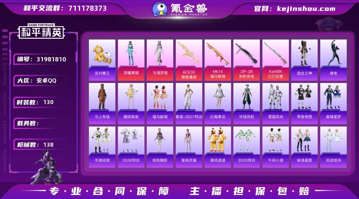 【0载具 4特效枪 2粉装 138枪皮 130套装】小金鞋 地铁号满天赋 4万热力值 沙漠毒蛇,派对舞王,异瞳寒姬,冷漠罗丽 ACE32-萌骑漫游,Kar98K-巳巳如意,Mk14-福马献瑞,DP-28-豹影疾电 21/1 df34-11,编号:WPMQM74