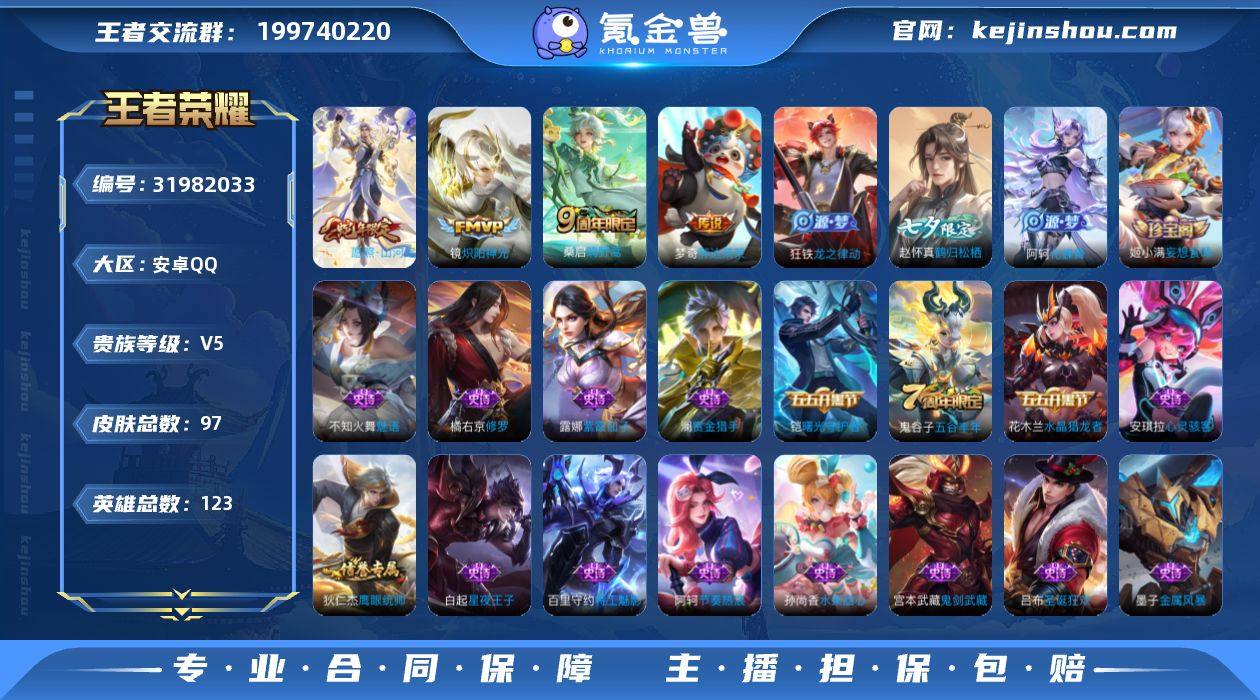 W14461 可立即换绑无需挂单养号 铭文满级 传说4 按键2 夺宝110 安卓Q-V5-尊贵铂金II段位-123英雄-97皮肤-4传说-26史诗 【传说皮肤】:司空震愿照山河定,桑启鸣野蒿,镜炽阳神光,梦奇胖达荣荣 【限定皮肤】:姜子牙天穹之誓,狄仁杰阴阳师,赵云皇家上将,项羽海滩派对,李元芳云中旅人,鬼谷子五谷丰年,沈梦溪大漠名商,裴擒虎擒涛扼浪,鲁班大师探海日志,桑启海盐诗旅,赵怀真鹤归松栖,张良古海寻踪,蒙犽百解令,鬼谷子天穹祈灯,姬小满妄想食味,刘邦剑破天穹,周瑜熔金海岸 【年限皮肤】:司空震愿照山河定 【赛季限定】:沈梦溪大漠名商,李元芳云中旅人,桑启海盐诗旅,裴擒虎擒涛扼浪,鲁班大师探海日志,张良古海寻踪,鬼谷子天穹祈灯,刘邦剑破天穹,姜子牙天穹之誓,太乙真人谧流熔炉,钟馗虚灵犬护,甄姬逆浪荇歌 【史诗皮肤】:露娜紫霞仙子,赵云皇家上将,貂蝉圣诞恋歌,王昭君偶像歌手,宫本武藏鬼剑武藏,孙尚香水果甜心,嬴政摇滚巨星,妲己魅力维加斯,墨子金属风暴,吕布圣诞狂欢,花木兰水晶猎龙者,安琪拉心灵骇客,百里守约特工魅影,铠曙光守护者,白起星夜王子,阿轲节奏热浪,狄仁杰鹰眼统帅,不知火舞魅语,橘右京修罗,澜赏金猎手,鬼谷子五谷丰年,赵怀真鹤归松栖,蒙犽百解令,姬小满妄想食味,阿轲化蝶舞,狂铁龙之律动 【其他皮肤】:项羽海滩派对,韩信街头霸王,赵云白执事,武则天东方不败,扁鹊救世之瞳,典韦黄金武士,亚瑟死亡骑士,花木兰兔女郎,张飞五福同心,宫本武藏万象初新,狄仁杰阴阳师,刘备汉昭烈帝,关羽龙腾万里,王昭君幻想奇妙夜,狂铁命运角斗场,吕布野性能量,哪吒次元突破,狂铁特工战影,鲁班大师乓乓大师,沈梦溪大漠名商,蒙恬蔚蓝守将,李元芳云中旅人,桑启海盐诗旅,猪八戒潮玩探月行,裴擒虎擒涛扼浪,鲁班大师探海日志,姬小满零食...