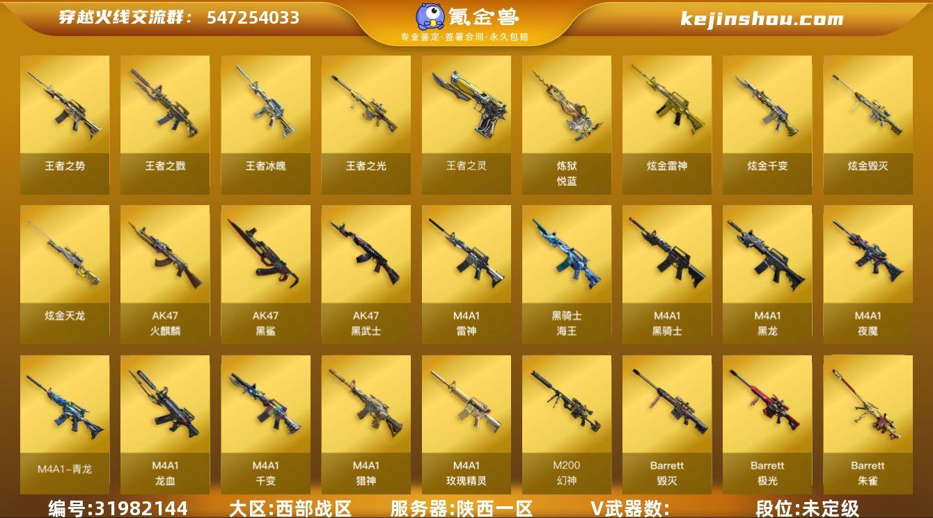 陕西一区-128V-5王者武器数-3炫金武器数 【热门武器】:QBZ03-金色蔷薇,Scar Light-白虎,M200-幻神,M200-竞技荣光,M4A1-黑骑士,汤姆逊-烈龙*6,加特林-炼狱,斯泰尔-蝴蝶,USP-雷暴*2,COP-堕天神*3,沙鹰-修罗*3,金刚伞 【王者炫金武器】:炫金黑龙,炫金雷神,炫金天神 【音效卡】:M200-幻神音效卡,AK47-火麒麟音效卡,M4A1-雷神音效卡,M4A1-黑骑士音效卡,Barrett-毁灭音效卡,炼狱-百战金芒-庆典舞曲音效卡,柯尔特-百战金芒-庆典舞曲音效卡 【皮肤】:幻神-AG-CFPLS17冠军,雷神-暗月,M4A1-战神赵云,M4A1-再燃火线,火麒麟-战神关羽,毁灭耀金皮肤*2,毁灭-英雄计划 皮肤,AK47-B-常胜将军-刘备*2,AK47-B-常胜将军-孙权,轻型军用手斧-再燃火线 【角色】:葵,樱,魅影,炫,春,电竞教官-云悠悠,王者-瞳-闭月羞花,王者-葵-貂蝉,暗夜-X,风暴女,灵狐者-职业经理,青霞仙子,职业选手 【人偶武器】:斯泰尔-蝴蝶,巴雷特-零-水下丽影,迷你深渊冰龙,迷你牛牛,闪光弹-貂蝉,高爆手雷-大乔 【暴走生化】:超级对讲机 【挑战大师】:火狱乱世-超越Max,激光毁灭者III-白马银枪,激光毁灭者III,机甲撕裂者III,神圣爆裂者-末日III 【英雄级武器】:AK47-火麒麟,M4A1-黑龙,M4A1-雷神,M4A1-黑骑士,AK47-黑武士,AK47-黑鲨*3,AK47-雷暴,M4A1-堕天神*2,Scar Light-白虎,FAMAS G2-天戎,QBZ03-金色蔷薇,王者之戮-觉醒版,AK-47-猩红传说,AK47-B-常胜将军,Barrett-毁灭*2,M200-幻神,Barrett-朱雀,M200-竞技荣光,加特林-炼狱,炼狱-百战金芒,汤姆逊-烈龙*6,沙鹰-修罗*3,沙鹰-天神,USP-雷暴*2,COP-堕天神*3,柯尔特-竞技荣光,屠龙*4,龙啸,麒麟刺-堕天神*3,擎天,麒麟刺,幻灵之锋*2,擎天-竞技荣光,龙啸-堕天神,斩神刀-雷暴,麒麟刺-百战金芒,王者之锋-觉醒版,王者之啸-觉...