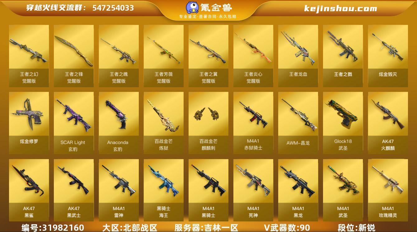 吉林一区-94V-8王者-3炫金 【热门武器】:QBZ03-金色蔷薇,HK417-朱雀,M200-幻神,白虎-电玩蓝兔,柯尔特-冠军之特,M4A1-黑骑士*3,汤姆逊-烈龙*9,RPK-盘龙*2,加特林-炼狱*2,斯泰尔-蝴蝶,沙鹰-修罗,Knife-冠军之刃 【王者炫金武器】:王者之戮,王者龙血,炫金毁灭,炫金修罗*2 【音效卡】:M4A1-黑龙音效卡,M4A1-黑骑士音效卡,Barrett-碧霄极光音效卡,炼狱-百战金芒-庆典舞曲音效卡,沙鹰-修罗-盛典舞曲音效卡 【皮肤】:幻神-动感闪耀 皮肤,幻神-AG-CFPL S24冠军 皮肤,QBZ03-冠军之薇,QBZ03-AG-CFPLS19冠军,金色蔷薇-纸灯龙皮肤,裁决-巅峰荣耀 皮肤,裁决-羽掣 皮肤,雷神-冠军之魄,雷神-R.LGD-CFPLS18冠军,雷神-宇航兔皮肤,雷神-诺拉 皮肤,M4A1-再燃火线,火麒麟-巅峰荣耀,火麒麟-心动糖果,毁灭耀金皮肤,毁灭-冠军之怒,黑骑士-冠军之势,死神-机甲核心皮肤,AK47-B-常胜将军-刘备,轻型军用手斧-再燃火线,擎天-冠军之击 【角色】:樱,玄豹,战地猎狐,王者涂鸦,王者-魅影,王者潘多拉,奇洋探员,乔伊教练,云海玲珑,北极狐-X,娟娟,卡塔琳娜,兰-新年限定,灵动武士,灵狐者-X,灵狐者-黄金海岸,龙儿,麻雀,潘多拉-X,潜龙队-X,青霞仙子,斯沃特-X,蜀雪,铁骑荣耀,兔囡囡,维纳斯,新娜塔莎,雪莉杨,影武者-X,智影,雅典娜 【人偶武器】:异变清道夫-蛇影双骄,斯泰尔-蝴蝶,COP-旗袍,迷你超能女侍 【暴走生化】:超级对讲机 【挑战大师】:神圣爆裂者III,激光毁灭者III 【英雄级武器】:AK47-火麒麟*2,M4A1-黑龙,M4A1-雷神,M4A1-黑骑士*3,M4A1-死神,AK47-黑武士*2,AK12-天启,AN94-超新星,M4A1-武圣,AK47-黑鲨,HK417-朱雀,SCAR Light-玄豹,M4A1-玫瑰精灵,QBZ03-金色蔷薇,烈火-动感闪耀,王者之翼-觉醒版,王者之魄-觉醒版,王者之幻-觉醒版,AK-47-猩红传...