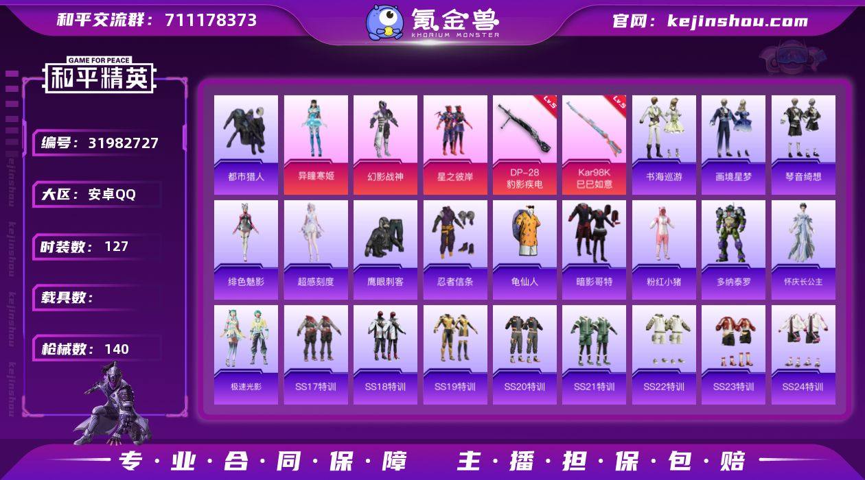 安卓 手Q-3粉装-5特效枪-0载具-2粉色飞行器-40791热力值-2王牌印记-127套装-140枪皮 【热门品类】:套装-都市猎人,套装-忍者信条,套装-龟仙人,套装-暗影哥特,套装-粉红小猪 【粉色套装】:粉装-幻影战神,粉装-星之彼岸,角色-异瞳寒姬 【粉色枪皮等级】:AKS-74U-森灵之息(五级),Kar98K-巳巳如意(五级),Mk14-福马献瑞(五级),DP-28-豹影疾电(五级),PKM-萌骑夺宝(五级) 【粉色枪皮】:AKS-74U-森灵之息,Kar98K-巳巳如意,Mk14-福马献瑞,DP-28-豹影疾电,PKM-萌骑夺宝 【粉色飞行器】:绝对恒星飞行器,炫彩糖果飞行器 【粉色降落伞】:绝对恒星降落伞,橘柚倾心降落伞,异瞳寒姬降落伞,炫彩糖果降落伞 【稀有套装】:套装-龟仙人,角色-超感刻度,套装-雪国风尚,套装-炫彩糖果,角色-魂电,角色-X,套装-马上有钱,角色-多纳泰罗,角色-怀庆长公主,套装-极速光影,角色-绯色魅影,套装-书海巡游,套装-画境星梦,套装-琴音绮想,套装-雨过天青,套装-红釉青花 【稀有枪皮】:AUG-冰晶雪宝,AKM-彩虹符号,AKM-影袭,AKM-灼热熔岩,AKM-生命誓言,AKM-破晓战魂,AKM-霓虹街区,AKM-龙的传人,M16A4-幻世战舞者,SCAR-L-夜灯,SCAR-L-炫彩节奏,SCAR-L-玉兔迎春,SCAR-L-红色方程式,M416-红色方程式,M416-绯红前夜,M416-蓝色火焰,GROZA-影袭,AUG-天降萌叽,AUG-幻影战神,AUG-耀粉歌者,QBZ-未来歌姬,QBZ-飞驰魅影,M762-第五大道,AC-VAL-天降萌叽,蜜獾-天降萌叽,ACE32-画境星梦,UZI-天降萌叽,UZI-幻影战神,UZI-影袭,UZI-红色方程式,UMP45-夜灯,UMP45-炫光之旅,UMP45-生命誓言,UMP45-蓝色火焰,Vector-生命誓言,汤姆逊-幻影战神,汤姆逊-炫彩节奏,野牛-天星战神,MP5K-画境星梦,P90-飞驰魅影,Kar98K-影袭,Kar98K-炫彩节奏,Kar98K-飞驰魅影,M24-影袭,M24-炫彩节奏,AWM-恐龙拽...