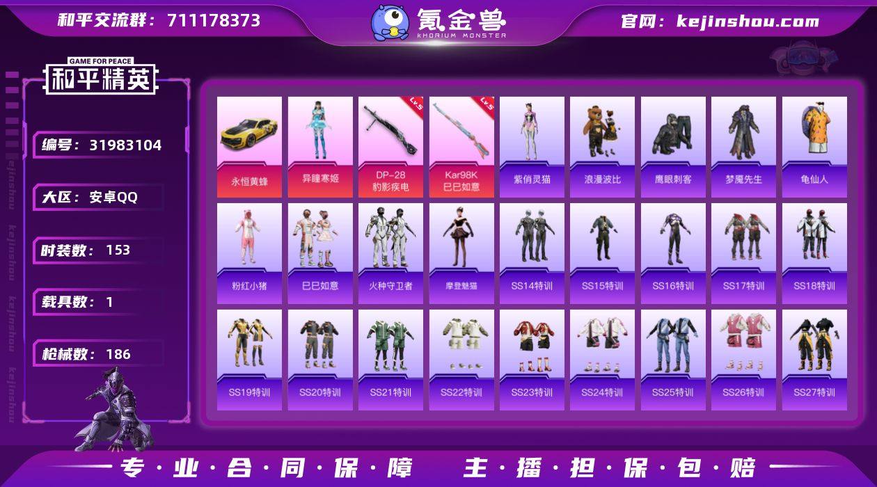 【AZH2933】安卓 手Q【异瞳寒姬 摩登魅猫元气发射 1载具】1粉装-3特效枪-1载具-2粉色飞行器-51786热力值-5王牌印记-153套装-186枪皮 【热门品类】:套装-龟仙人,套装-浪漫波比,套装-粉红小猪 【粉色套装】:角色-异瞳寒姬 【粉色枪皮等级】:Kar98K-巳巳如意(五级),Mk14-福马献瑞(一级),DP-28-豹影疾电(五级) 【粉色载具】:永恒黄蜂 【粉色枪皮】:Kar98K-巳巳如意,Mk14-福马献瑞,DP-28-豹影疾电 【粉色飞行器】:炫彩糖果飞行器,梦幻火箭飞行器 【粉色降落伞】:梦幻火箭降落伞,神秘黑猫降落伞,齐天大圣降落伞,洛神天依降落伞,碧影闪光降落伞,黄族统领降落伞,炫光之旅降落伞,鬼刀降落伞,炫彩糖果降落伞 【稀有套装】:套装-龟仙人,套装-巳巳如意,套装-炫彩糖果,套装-火种守卫者,角色-摩登魅猫,角色-紫俏灵猫,套装-雨过天青,套装-红釉青花 【稀有枪皮】:AUG-冰晶雪宝,AKM-夜灯,AKM-彩虹符号,AKM-灼热熔岩,AKM-破晓战魂,AKM-萌趣颜团子,AKM-虎虎生威,AKM-霓虹街区,AKM-龙的传人,M16A4-夜灯,M16A4-幻世战舞者,M16A4-红色方程式,M16A4-蓝色火焰,SCAR-L-夜灯,SCAR-L-炫彩节奏,SCAR-L-玉兔迎春,SCAR-L-红色方程式,M416-夜灯,M416-糯团青竹,M416-红色方程式,M416-蓝色火焰,GROZA-彩虹符号,GROZA-懵萌河马,GROZA-治愈之星,GROZA-田园牧歌,GROZA-蓝莓炮弹,AUG-2P战斗服款,AUG-耀粉歌者,AUG-青春冒险家,QBZ-洛神天依,QBZ-赛罗,M762-天降萌叽,M762-瑞龙福将,M762-第五大道,M762-绯红前夜,Mk47-洛神天依,Mk47-青春冒险家,G36C-懵萌河马,AC-VAL-天降萌叽,蜜獾-天降萌叽,蜜獾-娇憨猪猪,UZI-啾咪啾咪,UZI-天降萌叽,UZI-娇憨猪猪,UZI-影袭,UZI-炫彩节奏,UZI-红色方程式,UMP45-夜灯,UMP45-生命誓言,UMP45-蓝色火焰,Vector-彩虹符号,Vector-治愈之星,...