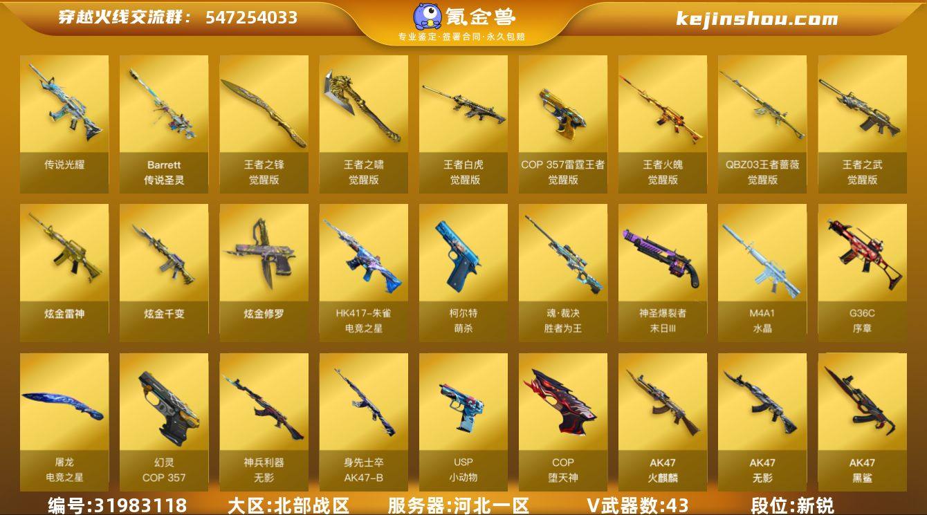 实名:可二次实名 段位:新锐 VIP等级:VIP6 V武器数:43 王者武器数:8 CF点:2268 传说光耀,传说圣灵 G36C-序章,魂·裁决-胜者为王,HK417-朱雀-电竞之星,柯尔特-萌杀,M4A1-水晶,神圣爆裂者-末日III,屠龙-电竞之星,COP 357-幻灵,无影-神兵利器,AK47-B-身先士卒,USP-小动物,COP-堕天神,AK47-火麒麟,AK47-无影,AK47-黑鲨,M4A1-雷神,黑骑士-海王,M4A1-黑骑士,M4A1-死神,M4A1-黑龙,M4A1-幻灵,白虎-电玩蓝兔,M200-幻神,Barrett-朱雀,AN94-超新星,QBZ03-金色蔷薇,9A91-烈火,屠龙,麒麟刺,龙啸-荣耀世冠,AK47-B-常胜将军,Barrett-暗月传说,幻灵之锋,AK47-B-战士,AK47-B-战神,AK-47-猩红传说,天神,唐刀神工天巧,龙啸-烈火龙威,烈火-动感闪耀,天神-动感闪耀,屠龙-动感闪耀,擎天-云海游龙 王者之锋-觉醒版,王者之啸-觉醒版,王者白虎-觉醒版,COP 357-雷霆王者-觉醒版,王者火魄-觉醒版,QBZ-03-王者蔷薇-觉醒版,王者之武-觉醒版 HK417-朱雀-电竞之星-竞星跃动音效卡,屠龙-电竞之星-竞星跃动音效卡,云海游龙音效卡,烈火动感闪耀音效卡,天神动感闪耀音效卡,M200-幻神音效卡,M4A1-黑骑士音效卡 炫金雷神,炫金千变,炫金修罗 羊驼玩偶,魔能飞环-曼陀罗,天龙-乔伊教练,海滩汪汪-巴雷特,雷神-小红,天龙-曼陀罗,M37-葵,猫猫手套 卖家说:幻神三件套 满副 白虎