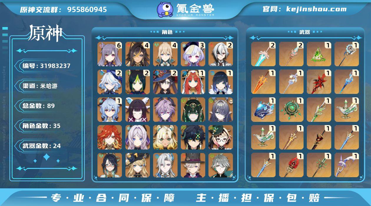 冒险等级:60 总黄数:89 5星角色数:35 5星武器数:24 原石数量:560 纠缠之源数量:0 6命刻晴,4命迪希雅,4命琴,3命七七,2命阿蕾奇诺,2命芙宁娜,2命提纳里,2命莫娜,1命妮露,1命夜兰,1命甘雨,0命哥伦比娅,0命杜林,0命奈芙尔,0命菈乌玛,0命玛薇卡,0命茜特菈莉,0命希诺宁,0命基尼奇,0命艾梅莉埃,0命闲云,0命娜维娅,0命那维莱特,0命林尼,0命艾尔海森,0命流浪者,0命纳西妲,0命赛诺,0命八重神子,0命魈,0命雷电将军,0命枫原万叶,0命钟离,0命温迪,0命迪卢克 6命班尼特,6命嘉明,6命久岐忍,6命蓝砚,6命赛索斯,6命香菱,6命行秋,6命夏沃蕾,6命伊法,6命芭芭拉,6命北斗,6命重云,6命迪奥娜,6命多莉,6命菲谢尔,6命九条裟罗,6命坎蒂丝,6命柯莱,6命雷泽,6命罗莎莉亚,6命莱依拉,6命诺艾尔,6命凝光,6命砂糖,6命托马,6命五郎,6命辛焱,6命烟绯,6命瑶瑶,6命云堇,6命早柚,5命菲米尼,5命珐露珊,5命米卡,4命卡齐娜,4命绮良良,3命琳妮特,3命伊安珊,3命凯亚,3命卡维,2命爱诺,2命夏洛蒂,2命安柏,1命塔利雅,1命鹿野院平藏,0命雅珂达,0命欧洛伦,0命丽莎 精2天空之傲,精2天空之脊,精1真语秘匣,精1支离轮光,精1焚曜千阳,精1柔灯挽歌,精1赤月之形,精1静水流涌之辉,精1万世流涌大典,精1碧落之珑,精1裁叶萃光,精1千夜浮梦,精1圣显之钥,精1赤角石溃杵,精1苍古自由之誓,精1护摩之杖,精1和璞鸢,精1阿莫斯之弓,精1风鹰剑,精1天空之刃,精1四风原典 100%侦察骑士,古恩希尔德的传承,帆影游风,极夜真梦,倩影游侠,岁夜欢哗,纱中幽兰,星与月之约,雨化竹身,叶隐芳名,致教会自由人
