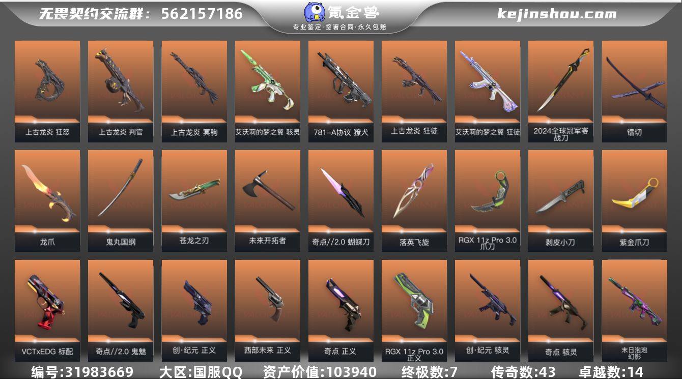 【自带包赔 可赔三倍】:大库存多赛季超凡24冠军号,库存价值103940 【限定】: 5周年//公测重制版 苍龙之刃, 2024全球冠军赛 幻影, 2024全球冠军赛 战刀 【近战】: 剥皮小刀, 5周年//公测重制版 苍龙之刃, 紫金爪刀, 未来开拓者, 镭切, 龙爪, 鬼丸国纲, 奇点//2.0 蝴蝶刀, 2024全球冠军赛 战刀, RGX 11z Pro//3.0 爪刀, 落英飞旋 【狂徒】: 日冕雄师 狂徒, 光荣异象 狂徒, 离子武器//2.0 狂徒, 洪荒怒焰 狂徒, 耀鳞威龙 狂徒, 创·纪元 狂徒, 上古龙炎 狂徒, 般若假面//2.0 狂徒, 艾沃莉的梦之翼 狂徒, 掠影 狂徒, 奇点//2.0 狂徒, 混沌序曲 狂徒, 塑水宗 狂徒, 盖世英雄 狂徒 【幻影】: 末日泡泡 幻影, 西部未来 幻影, 侦察力量 幻影, 奇点 幻影, 2024全球冠军赛 幻影, 般若假面 幻影 【冥驹】: 上古龙炎 冥驹, 千灵华绽 冥驹 【正义】: 西部未来 正义, 创·纪元 正义, 奇点 正义, RGX 11z Pro//3.0 正义, 离子武器 正义 【戍卫】: 掠影 戍卫 【獠犬】: 781-A协议 獠犬, 般若假面//2.0 獠犬 【鬼魅】: 天界神兵 鬼魅, 奇点//2.0 鬼魅 【骇灵】: 艾沃莉的梦之翼 骇灵, 创·纪元 骇灵, 奇点 骇灵 【标配】: VCT x EDG 标配 【狂怒】: 上古龙炎 狂怒, 般若假面//2.0 狂怒 【判官】: 上古龙炎 判官 【飞将】: 西部未来 飞将 【战神】: 般若假面//2.0 战神 【奥丁】: 西部未来 奥丁 【莽侠】: 创·纪元 莽侠, RGX 11z Pro//3.0 莽侠 【充值总皮肤】: 末日泡泡 幻影, 剥皮小刀, 5周年//公测重制版 苍龙之刃, 日冕雄师 狂徒, 天界神兵 鬼魅, 光荣异象 狂徒, 离子武器//2.0 狂徒, 艾沃莉的梦之翼 骇灵, 紫金爪刀, 781-A协议 獠犬, 洪荒怒焰 狂徒, 耀鳞威龙 狂徒, 西部未来 幻影, 西部未来 飞将, 西部未来 奥丁, 未来开拓者, 西部未来 正义, 侦察力量 幻影, 创·纪元 狂徒, 镭切, 创·纪元 莽侠, 创·纪元 正义...