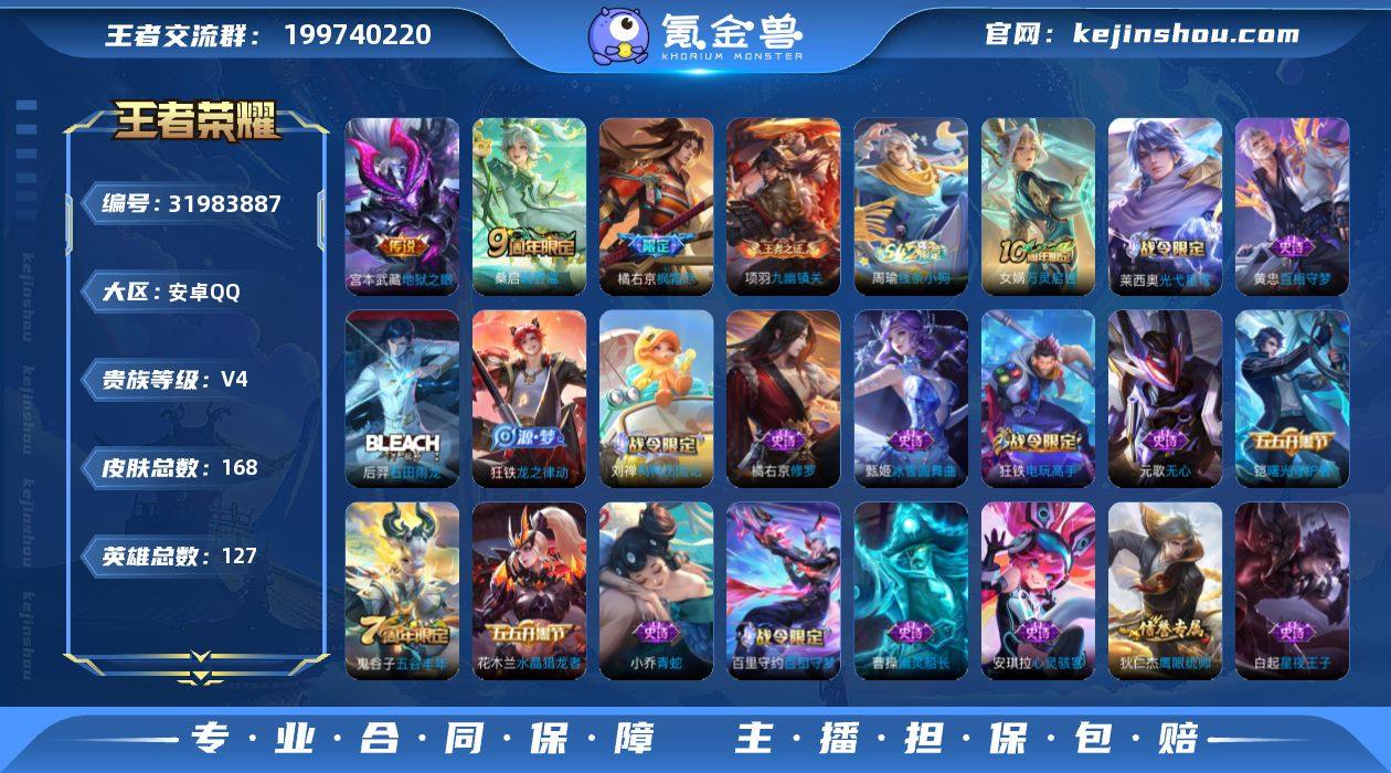 【高性价比·1.2W金标橘右京·金标万战狂铁·1.2W金标刘邦·金标万战花木兰·金标吕布·全皮橘右京·地狱之眼·枫霜尽·无心·可二次】YXw16800-安卓Q-127英雄-168皮肤-13王者印记-220铭文-贵族积分0【贵族4】【3传说·2按键·261幸运值】【因赛季更新游戏段付以上号为准!】 【英雄全皮】:孙权全皮,橘右京全皮 【传说皮肤】:桑启鸣野蒿,橘右京枫霜尽,宫本武藏地狱之眼 【限定皮肤】:狄仁杰阴阳师,高渐离玩趣恶龙,元歌无心,狄仁杰万华元夜,达摩沙漠行僧,项羽海滩派对,程咬金演武夺筹,王昭君午后时光,兰陵王金庭之子,橘右京枫霜尽,李元芳云中旅人,钟馗驱傩正仪,鬼谷子原初探秘者,鬼谷子五谷丰年,苏烈千军破阵,百里玄策原初追逐者,梦奇顽趣,沈梦溪大漠名商,裴擒虎擒涛扼浪,狂铁电玩高手,鲁班大师探海日志,桑启海盐诗旅,张良古海寻踪,蒙恬荣光圣徽,鬼谷子天穹祈灯,刘邦剑破天穹,程咬金群星魔术团 【赛季限定】:鬼谷子原初探秘者,狄仁杰万华元夜,程咬金演武夺筹,钟馗驱傩正仪,苏烈千军破阵,达摩沙漠行僧,兰陵王金庭之子,沈梦溪大漠名商,李元芳云中旅人,桑启海盐诗旅,裴擒虎擒涛扼浪,鲁班大师探海日志,张良古海寻踪,鬼谷子天穹祈灯,刘邦剑破天穹,东皇太一噬灭天穹,太乙真人谧流熔炉,钟馗虚灵犬护,甄姬逆浪荇歌,亚瑟荣光之誓,百里玄策原初追逐者,梦奇顽趣,蒙恬荣光圣徽,牛魔星界战将,项羽九幽镇关 【战令限定】:狂铁电玩高手,王昭君午后时光,百里守约百相守梦,老夫子百相守梦,刘禅鸭鸭历险记,沈梦溪鸭鸭历险记,莱西奥光弋星穹,明世隐往忆晖光,周瑜线条小狗 【史诗皮肤】:貂蝉圣诞恋歌,甄姬冰雪圆舞曲,王昭君偶像歌手,宫本武藏鬼剑武藏,孙尚香水果甜心,妲己魅力维加斯,墨子金属风暴,吕布圣诞狂欢,曹操幽灵船长,张飞乱世虎臣,花木兰水晶猎龙者,刘邦德古...