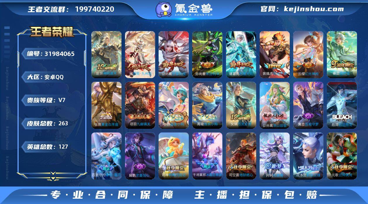 【特价出售】安卓Q-V7-至尊星耀IV段位-127英雄-263皮肤-9传说-80史诗 【英雄全皮】:刘禅全皮,孙权全皮,影全皮 【传说皮肤】:后羿神树通天,澜愿照九州拓,云缨幻光神枪,裴擒虎祥瑞亨通,桑启鸣野蒿,公孙离祈雪灵祝,诸葛亮时雨天司,张良黄金白羊座,孙尚香末日机甲 【限定皮肤】:蔡文姬夏日便利店,虞姬夏日便利店,姜子牙天穹之誓,狄仁杰阴阳师,赵云皇家上将,墨子神迹守卫,庄周高山流水,高渐离死亡摇滚,高渐离玩趣恶龙,芈月白晶晶,吕布御风骁将,元歌云间偶戏,元歌无心,狄仁杰魔术师,狄仁杰万华元夜,达摩星际陆战队,达摩沙漠行僧,项羽海滩派对,项羽霸王别姬,老夫子航海奇遇记,程咬金演武夺筹,兰陵王金庭之子,花木兰默契交锋,亚瑟潮玩骑士王,牛魔奔雷神使,李元芳云中旅人,虞姬霸王别姬,钟馗驱傩正仪,干将莫邪冰霜恋舞曲,雅典娜黎明之约,太乙真人华丽摇滚,鬼谷子五谷丰年,诸葛亮时雨天司,苏烈千军破阵,百里玄策原初追逐者,梦奇顽趣,公孙离祈雪灵祝,沈梦溪大漠名商,裴擒虎擒涛扼浪,米莱狄胡桃异想国,猪八戒猪悟能,上官婉儿梁祝,嫦娥暖冬兔眠,鲁班大师探海日志,桑启海盐诗旅,暃星界游侠,艾琳女武神,艾琳流音漫舞,司空震地狱燃心,阿古朵江河有灵,张良古海寻踪,蒙犽百解令,蒙恬荣光圣徽,鬼谷子天穹祈灯,沈梦溪龙舞盛年,刘邦剑破天穹,程咬金群星魔术团,镜青焰无极,项羽苍威无极,周瑜熔金海岸 【年限皮肤】:公孙离祈雪灵祝,诸葛亮时雨天司,吕布御风骁将,牛魔奔雷神使,澜愿照九州拓 【赛季限定】:狄仁杰万华元夜,程咬金演武夺筹,钟馗驱傩正仪,苏烈千军破阵,达摩沙漠行僧,兰陵王金庭之子,沈梦溪大漠名商,李元芳云中旅人,桑启海盐诗旅,裴擒虎擒涛扼浪,鲁班大师探海日志,张良古海寻踪,鬼谷子天穹祈灯,刘邦剑破天穹,姜子牙天穹之誓,东...