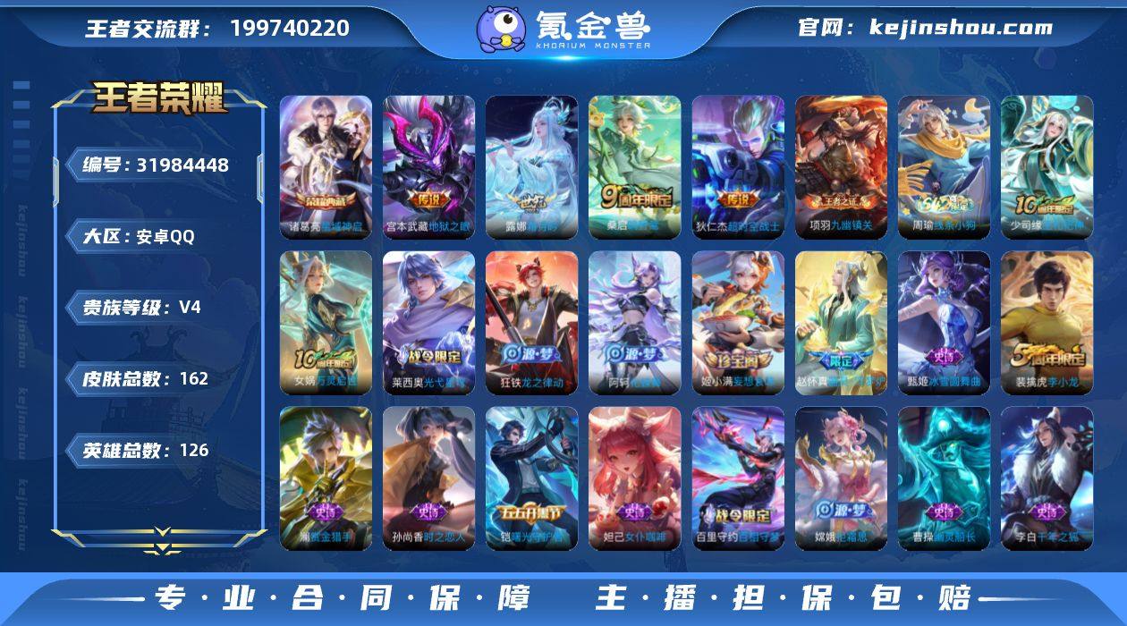 【mwz212】安卓Q-V4-永恒钻石III段位-126英雄-162皮肤-1典藏皮肤-4传说-42史诗 【荣耀典藏】:诸葛亮星域神启 【传说皮肤】:桑启鸣野蒿,露娜霜月吟,宫本武藏地狱之眼,狄仁杰超时空战士 【限定皮肤】:蒙犽顽岩魄,姜子牙天穹之誓,狄仁杰阴阳师,赵云皇家上将,项羽海滩派对,裴擒虎李小龙,云中君纤云弄巧,嫦娥拒霜思,艾琳流音漫舞,阿古朵江河有灵,张良古海寻踪,蒙犽百解令,鬼谷子天穹祈灯,姬小满妄想食味,沈梦溪龙舞盛年,刘邦剑破天穹 【赛季限定】:张良古海寻踪,鬼谷子天穹祈灯,刘邦剑破天穹,姜子牙天穹之誓,东皇太一噬灭天穹,太乙真人谧流熔炉,钟馗虚灵犬护,甄姬逆浪荇歌,亚瑟荣光之誓,牛魔星界战将,项羽九幽镇关 【战令限定】:艾琳流音漫舞,百里守约百相守梦,老夫子百相守梦,孙膑茶境仙,马超访茗客,莱西奥光弋星穹,明世隐往忆晖光,周瑜线条小狗 【史诗皮肤】:周瑜线条小狗,项羽九幽镇关,少司缘巫礼祀神,女娲万灵启世,莱西奥光弋星穹,狂铁龙之律动,阿轲化蝶舞,赵怀真器灵浮梦炉,孙膑茶境仙,牛魔星界战将,百里守约百相守梦,蒙犽顽岩魄,姬小满妄想食味,蒙犽百解令,阿古朵江河有灵,澜赏金猎手,嫦娥拒霜思,钟馗乐园奇幻夜,百里玄策热力回旋,云中君纤云弄巧,裴擒虎李小龙,孙尚香时之恋人,狄仁杰鹰眼统帅,伽罗箭羽风息,孙策猫狗日记,铠曙光守护者,雅典娜冰冠公主,亚瑟心灵战警,诸葛亮黄金分割率,夏侯惇乘风破浪,刘邦德古拉伯爵,李白千年之狐,曹操幽灵船长,吕布圣诞狂欢,妲己女仆咖啡,妲己魅力维加斯,嬴政摇滚巨星,嬴政暗夜贵公子,孙尚香水果甜心,宫本武藏鬼剑武藏,廉颇地狱岩魂,甄姬冰雪圆舞曲,赵云皇家上将 【其他皮肤】:兰陵王雾影缉谜,桑启线条小狗,曹操逐霄之志,艾琳鹤鸣心笺,张良罗小黑战记,明世隐往忆晖光,亚瑟荣光之誓,...