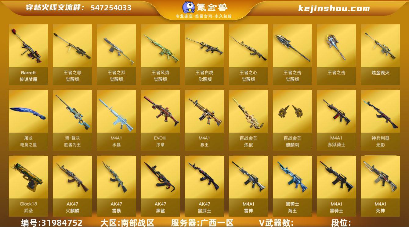 /南部/广西一区/可排位/段位未定段/Lv.102 荣耀元帅/110V/传说梦魇/竞技荣光套/QBZ金色蔷薇/朱雀/白虎电玩蓝兔/王者白虎/王者凤吟/雷暴套/动感闪耀套/独角之刃/毁灭/极光/天龙/雷神/黑骑士/4炼狱/五套雷暴雷/【音效卡】/雷神音效卡/毁灭音效卡/碧霄极光音效卡/炼狱百战金芒庆典舞曲音效卡/【枪皮】/荣耀之怒/毁灭魔灵/火麒麟百城/雷神虎将/【四防角色】/王者魅影/电竞教官云悠悠/【角色】/审判者/零/葵/樱/瞳/隼/王者凌霄/【小人枪】/裁决雪莉杨/斯泰尔蝴蝶/COP旗袍/【道具】/永久护目镜/超级背包/各种戒指/各种光效/各种玩偶/永久AC/永久雷包/细节看图/【此账号封十年已解】
