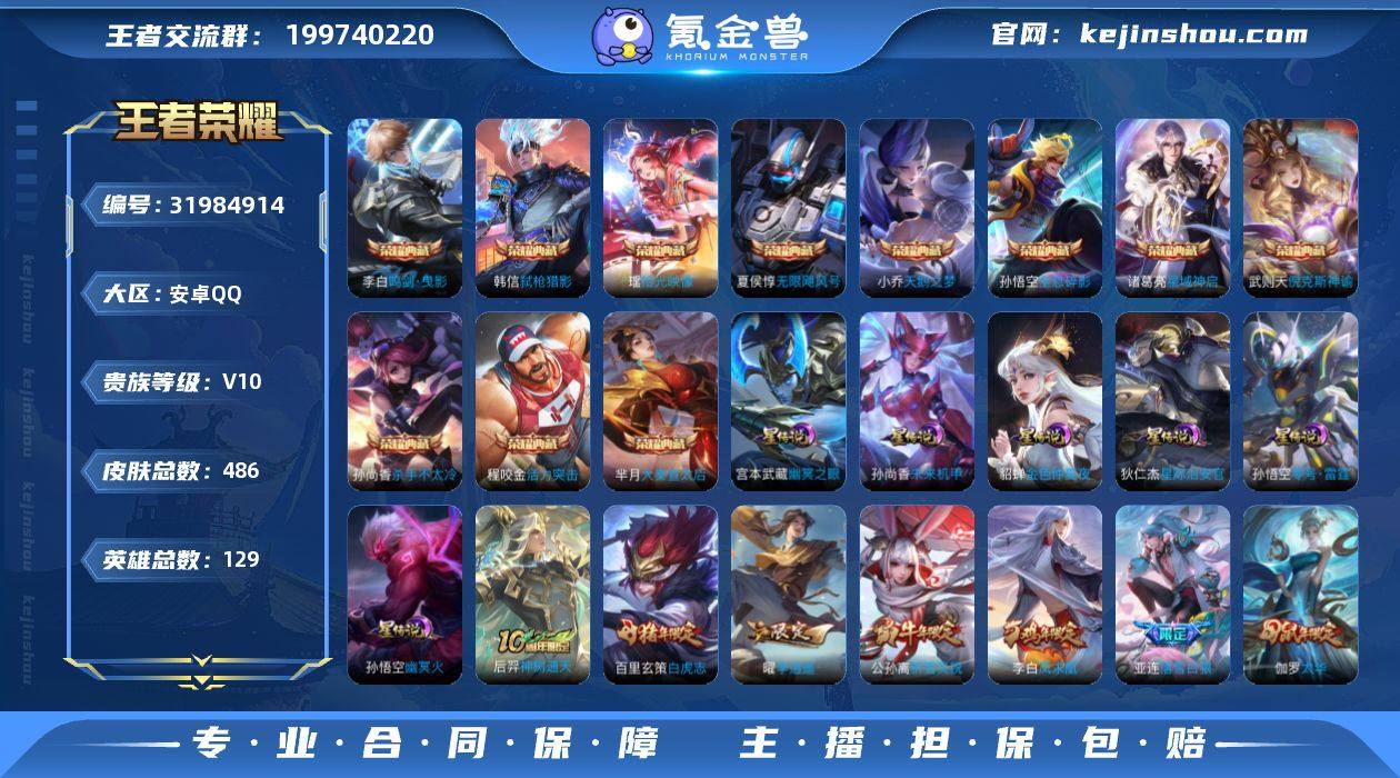实名: 可修改 贵族等级: V10 英雄数: 127 皮肤数: 506 荣耀水晶: 武则天,天鹅之梦,星空梦想,倪克斯神谕,无限飓风号,活力突击,杀手不太冷,大秦宣太后,鸣剑·曳影,全息碎影,星域神启,九霄神辉,赤影疾锋,银白咏叹调,最初的交响 传说皮: 黄金狮子座,黄金射手座,冠军飞将,云鹰飞将,绛天战甲,黄金白羊座,猫影幻舞,久胜战神,炽阳神光,一念神魔,云霓雀翎,末日机甲-孙尚香,地狱火,仲夏夜之梦,音你心动-小乔,零号·赤焰,海洋之心,地狱之眼,飞鸢探春,音你心动-周瑜,胖达荣荣,李逍遥,乞巧织情,时之恋人-刘备,游龙清影,淬星耀世,超时空战士-狄仁杰,遇见胡旋,末日机甲-孙策,挚爱之约,挚爱花嫁,无双飞将,音你闪耀,艾琳觅芳踪 限定皮: 冰锋战神,遇见飞天,李小龙,奔雷神使,祈雪灵祝,游园惊梦,梁祝,御风骁将,云端筑梦师,时雨天司,引擎之心,龙胆,白鹤梁神女,武圣,烈魂,魔法小厨娘,辉光之辰,异界灵契,玄嵩,白晶晶,岱宗,天狼溯光者,虎魄,天魔缭乱,神威,蜜橘之夏,幽恒,时之彼端,奇迹圣诞,飞衡,乒乒小将,太华,天狼征服者,青春决赛季,逐梦之翼,天狼狩猎者,冰霜恋舞曲,天狼运算者,逐梦之星,逐梦之影,热情桑巴,逐梦之光,神奇女侠,天狼绘梦者,凤求凰,寅虎·御盾,青龙志,瑞麟志,玄武志,朱雀志,凤凰于飞,如梦令-嫦娥,纯白花嫁,至尊宝,默契交锋-兰陵王,真爱至上,一生所爱,武陵仙君,如梦令-后羿,大圣娶亲,默契交锋-花木兰,寅虎·瑞焰,霸王别姬-项羽,霸王别姬-虞姬,高山流水,孙行者,猪悟能,匿光追影者,女儿国国王,傲雪梅枪,寅虎·赤拳,寅虎·心曲,寅虎·展翼,时之祈愿-云中君,时之祈愿-瑶,补天,百木心枪,玉兔公主,启示之音,匿光决锋者,无尽星芒,深海之息,唐三藏,匿光启智者,时之奇旅-妲己,星穹之声,五谷丰年,梦圆繁星