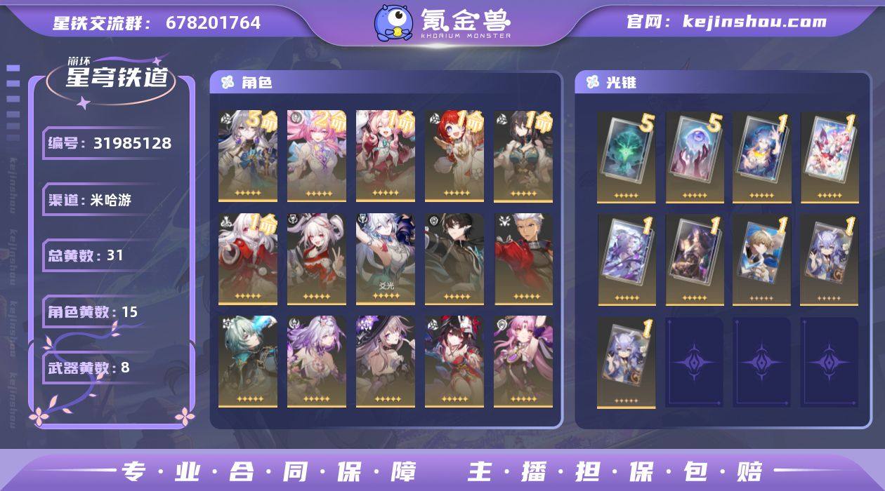 总黄数:31 五星光锥数:8 五星角色数:15 开拓等级:70 开拓者性别:女 星轨专票:0 梦华数量:0 星琼数量:0 3命布洛妮娅,2命昔涟,1命风堇,1命缇宝,1命阮·梅,1命克拉拉,0命火花,0命爻光,0命丹恒·腾荒,0命Archer,0命那刻夏,0命遐蝶,0命大黑塔,0命花火,0命符玄 5精不息的演算,5精记忆永不落幕,1精当她决定看见,1精愿虹光永驻天空,1精让告别,更美一些,1精向着不可追问处,1精制胜的瞬间,1精时节不居 换绑材料:可提供换绑材料 邮箱状态:未绑定 psn绑定情况:否 taptap绑定情况:否 邮箱实名情况:邮箱未实名