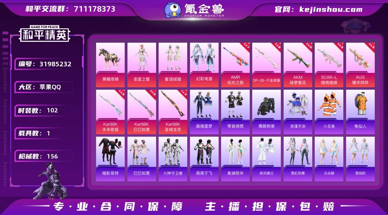 【ky628】苹果 手Q-4粉装-11特效枪-1载具-5粉色飞行器-49227热力值-8王牌印记-102套装-156枪皮 【热门品类】:套装-浪漫天命,套装-小丑鱼,套装-龟仙人,套装-暗影哥特 【粉色套装】:角色-圣堂之誓,粉装-蜜语绒猫,粉装-幻彩电音,角色-辉云木星 【粉色枪皮等级】:AKM-绿萝繁花(五级),SCAR-L-锦绣绵绵(五级),AUG-暖羊咩咩(五级),ACE32-萌骑漫游(三级),AKS-74U-森灵之息(五级),Kar98K-未来歌姬(五级),Kar98K-巳巳如意(五级),Kar98K-圣域龙灵(三级),Mk14-福马献瑞(五级),AMR-炫光之旅(七级),DP-28-千金淑猫(六级) 【粉色载具】:黑曜夜骑 【粉色枪皮】:AKM-绿萝繁花,SCAR-L-锦绣绵绵,AUG-暖羊咩咩,ACE32-萌骑漫游,AKS-74U-森灵之息,Kar98K-未来歌姬,Kar98K-巳巳如意,Kar98K-圣域龙灵,Mk14-福马献瑞,AMR-炫光之旅,DP-28-千金淑猫 【粉色飞行器】:香车宝马飞行器,沙丘之主天马,圣域金龙飞行器,时光之誓飞行器,谜鸦审判飞行器 【粉色降落伞】:至尊龙雀降落伞,千面幻镜降落伞,闲梦青缨降落伞,炫光之旅降落伞,绝色倾城降落伞,精灵之光降落伞,临安公主降落伞,霁蓝缠春降落伞,暮色玫影降落伞,罪夜之冕降落伞,虹云熊熊降落伞 【稀有套装】:套装-龟仙人,套装-巳巳如意,套装-马上有钱,套装-火种守卫者,套装-燕燕于飞,套装-鱼渊荷华,套装-新风雅兰,套装-霓虹热舞,套装-云朵鹅,套装-雪绒豹,套装-画境星梦,套装-琴音绮想,角色-月烬之祷,套装-雨过天青,套装-红釉青花,角色-缚爪幽影,角色-唐三 【稀有枪皮】:AKM-2P战斗服款,AKM-彩虹符号,AKM-破晓战魂,AKM-霓虹街区,AKM-龙的传人,SCAR-L-夜灯,M416-摩登王国,M416-糯团青竹,M416-蓝色火焰,GROZA-影袭,GROZA-懵萌河马,AUG-甜蜜菠萝,AUG-黑白懵懵牛,QBZ-彩虹符号,M762-甜心宝贝,M762-第五大道,M762-云朵...