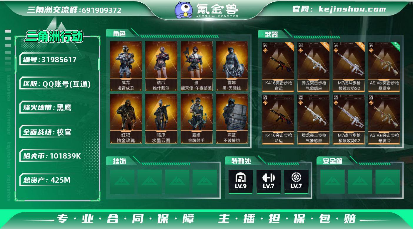 {特价出售}等级:60总资产:425.9M 纯币101M 隐藏挂饰: 2S财神到,2S黑夜猎手 红皮:威龙-凌霄戍卫/骇爪-维什戴尔/露娜-黑天际线/红狼-蚀金玫瑰/骇爪-水墨云图/蛊-能天使午夜邮差 /威龙-飞虎 刀皮: 近战-暗星/近战-处刑者/近战-龙牙/近战-信条/近战-北极星/近战-黑海/近战-影锋/近战-怜悯/ 砖皮: K416突击步枪-命运(极品C)/M7战斗步枪-棱镜攻势S2(极品C)/腾龙突击步枪-气象感应(极品C)/AS Val突击步枪-悬赏令(优品B)/AS Val突击步枪-悬赏令(优品C)/MP7冲锋枪-电玩高手S2(优品C) 特勤处:仓库9,训练7,靶场7,潜水3,部门33333 6313三角卷,1566三角币