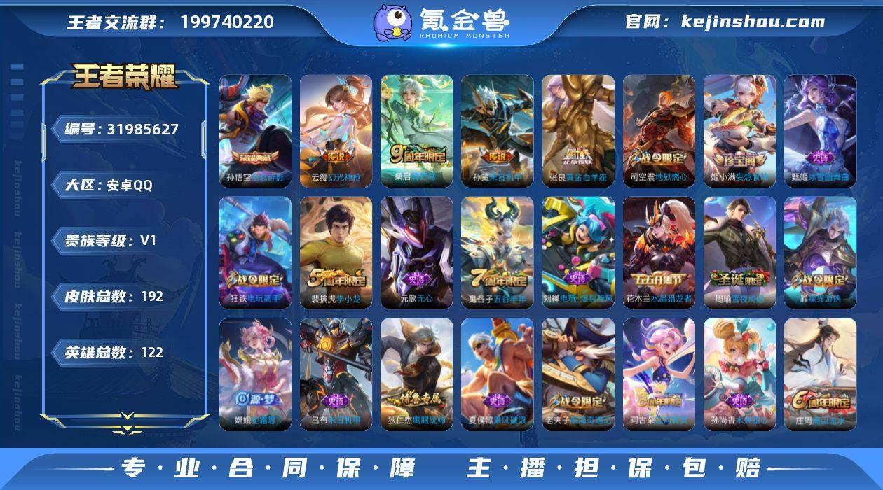 安卓Q-V0-最强王者段位-122英雄-192皮肤-1典藏皮肤-4传说-34史诗 【荣耀典藏】:孙悟空全息碎影 【传说皮肤】:云缨幻光神枪,桑启鸣野蒿,孙策末日机甲,张良黄金白羊座 【限定皮肤】:杨戬破阵退雄兵,狄仁杰阴阳师,赵云皇家上将,墨子神迹守卫,庄周高山流水,高渐离玩趣恶龙,扁鹊奇幻香踪,白起夜都怪侠,芈月幻夜卜梦,元歌无心,狄仁杰魔术师,狄仁杰万华元夜,达摩沙漠行僧,项羽海滩派对,老夫子航海奇遇记,程咬金演武夺筹,王昭君午后时光,兰陵王金庭之子,孙悟空美猴王,后羿圣弓游侠,李元芳云中旅人,钟馗驱傩正仪,杨戬潮玩骑兵,干将莫邪真爱魔法,鬼谷子原初探秘者,鬼谷子五谷丰年,黄忠火炮绅士,苏烈千军破阵,沈梦溪大漠名商,明世隐吟游魔法,裴擒虎李小龙,裴擒虎擒涛扼浪,狂铁电玩高手,嫦娥拒霜思,嫦娥暖冬兔眠,鲁班大师探海日志,桑启海盐诗旅,暃星界游侠,艾琳流音漫舞,司空震地狱燃心,阿古朵江河有灵,张良古海寻踪,蒙犽百解令,鬼谷子天穹祈灯,姬小满妄想食味,刘邦剑破天穹,刘备异域游侠 【年限皮肤】:孙悟空美猴王 【赛季限定】:鬼谷子原初探秘者,狄仁杰万华元夜,程咬金演武夺筹,钟馗驱傩正仪,苏烈千军破阵,达摩沙漠行僧,兰陵王金庭之子,沈梦溪大漠名商,李元芳云中旅人,桑启海盐诗旅,裴擒虎擒涛扼浪,鲁班大师探海日志,张良古海寻踪,鬼谷子天穹祈灯,刘邦剑破天穹,东皇太一噬灭天穹,太乙真人谧流熔炉,钟馗虚灵犬护 【战令限定】:老夫子航海奇遇记,墨子神迹守卫,干将莫邪真爱魔法,后羿圣弓游侠,黄忠火炮绅士,芈月幻夜卜梦,明世隐吟游魔法,白起夜都怪侠,狂铁电玩高手,王昭君午后时光,暃星界游侠,嫦娥暖冬兔眠,扁鹊奇幻香踪,杨戬潮玩骑兵,司空震地狱燃心,艾琳流音漫舞 【史诗皮肤】:姬小满妄想食味,周瑜雪夜绮愿,蒙犽百解令,阿古朵...