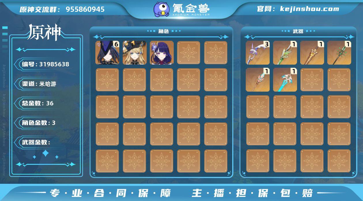 36黄 风元素:0命恰斯卡 雷元素:6命克洛琳德, 0命雷电将军, 0命八重神子 冰元素:1命丝柯克, 1命茜特菈莉 岩元素:0命娜维娅 【常驻五星角色及命座】 风元素:1命琴 火元素:4命迪卢克 水元素:0命莫娜 雷元素:1命刻晴 单手剑:精1圣显之钥, 精1天空之刃, 精1裁叶萃光, 精1赦罪 长柄武器:精1和璞鸢, 精1天空之脊, 精1柔灯挽歌 法器:精1四风原典 弓:精3阿莫斯之弓 【角色皮肤】 四星角色:香菱-岁夜欢哗, 班尼特-炽绘奇旅, 行秋-雨化竹身