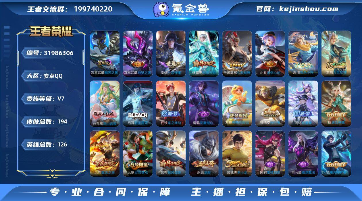 贵族等级: V7 英雄数: 126 皮肤数: 194 星传说: 幽冥之眼 传说皮: 久胜战神,一念神魔,音你心动-小乔,地狱之眼 限定皮: 李小龙,御风骁将,时雨天司,龙胆,辉光之辰,奇迹圣诞,霸王别姬-虞姬,孙行者