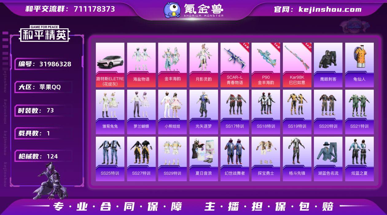 苹果 手Q-5粉装-6特效枪-1载具-1粉色飞行器-36352热力值-9王牌印记-73套装-124枪皮 【热门品类】:套装-龟仙人 【粉色套装】:粉装-海盐物语,粉装-金丰海韵,角色-月影灵韵,角色-花中眠,角色-月中灵 【粉色枪皮等级】:SCAR-L-青春物语(六级),ACE32-萌骑漫游(二级),UMP45-萌骑冒险(四级),P90-金丰海韵(六级),Kar98K-巳巳如意(二级),Mk14-福马献瑞(二级) 【粉色载具】:路特斯ELETRE(花绽灰) 【粉色枪皮】:SCAR-L-青春物语,ACE32-萌骑漫游,UMP45-萌骑冒险,P90-金丰海韵,Kar98K-巳巳如意,Mk14-福马献瑞 【粉色飞行器】:繁龙极客飞行器 【粉色降落伞】:恐龙拽拽降落伞,环太平洋降落伞,创世·救赎降落伞,守护天翼降落伞,金丰海韵降落伞 【稀有套装】:套装-龟仙人,套装-雏菊兔兔,套装-萝兰蝴蝶,套装-小熊娃娃,角色-光矢逐梦,套装-雨过天青,套装-红釉青花 【稀有枪皮】:AKM-奇异狩猎者,AKM-彩虹符号,AKM-灼热熔岩,AKM-虎虎生威,AKM-霓虹街区,AKM-龙的传人,M16A4-幻世战舞者,M16A4-甜心亚梦,M16A4-红色方程式,M16A4-蓝色火焰,SCAR-L-炫彩节奏,SCAR-L-黄金龙骨,SCAR-L-龙宫之主,M416-糯团青竹,M416-紫翼圣骑,M416-红色方程式,GROZA-异彩先驱,AUG-天降萌叽,AUG-纯梦嫁纱,AUG-耀粉歌者,AUG-月影灵韵,QBZ-彩虹符号,QBZ-飞驰魅影,M762-奇异狩猎者,M762-瑞龙福将,AC-VAL-甜心亚梦,蜜獾-娇憨猪猪,UZI-娇憨猪猪,UZI-红色方程式,UMP45-生命誓言,汤姆逊-天降萌叽,汤姆逊-奇异狩猎者,汤姆逊-异彩先驱,汤姆逊-炫彩节奏,MP5K-异彩先驱,MP5K-蓝莓炮弹,P90-飞驰魅影,Kar98K-炫彩节奏,Kar98K-红色方程式,Kar98K-蓝莓炮弹,Kar98K-飞驰魅影,M24-炫彩节奏,SKS-炫彩节奏,Mini14-异彩先驱,Mini14-星夜魔法师,Mini14-穿刺龙虾,Mini14-筑梦精灵,Mini14-耀粉歌者,W...