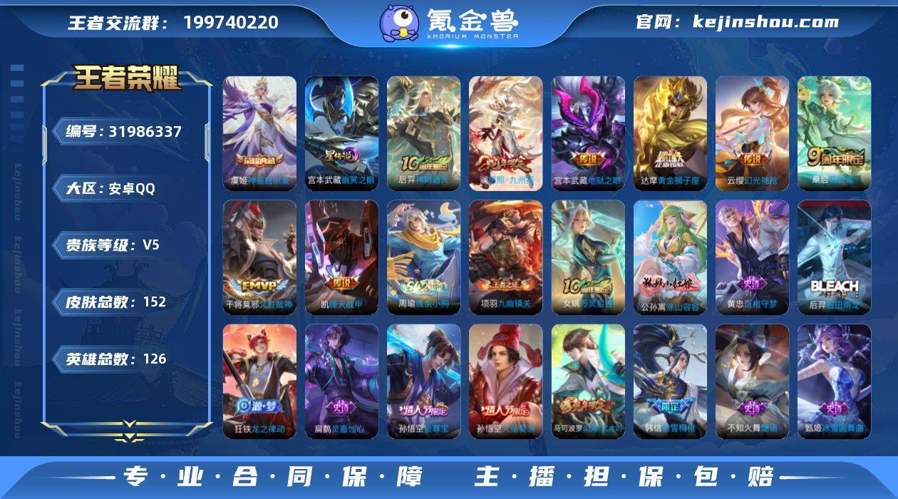 贵族等级:V5 典藏皮肤数:1 珍品无双皮肤数:0 无双皮肤数:0 珍品传说皮肤数:0 传说皮肤数:8 史诗皮肤数:44 皮肤数:152 英雄数:126 段位:星耀 卖家说:有一个荣耀典藏,有至尊宝和大圣娶亲