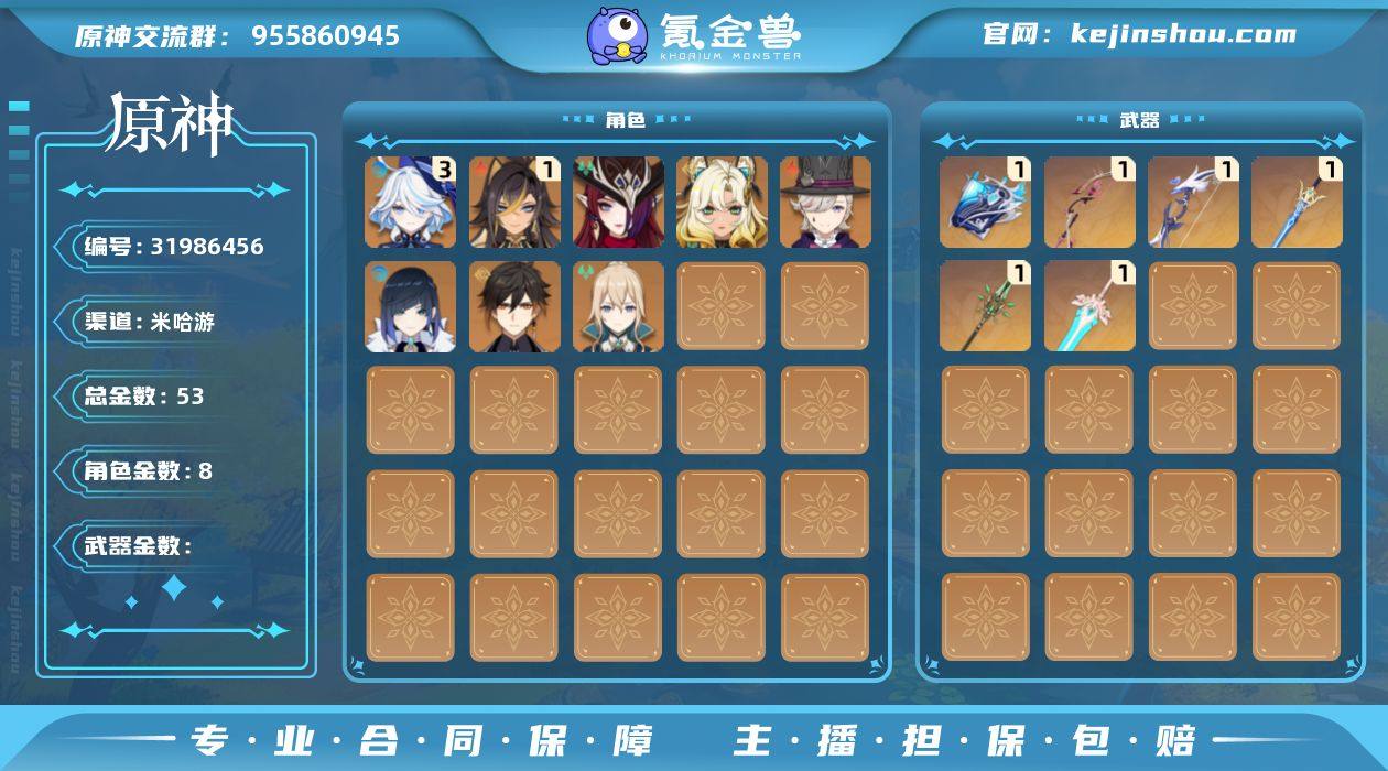 冒险等级:60 总黄数:100 5星角色数:28 5星武器数:37 原石数量:1167 纠缠之源数量:5 6命玛薇卡,5命迪卢克,5命莫娜,3命迪希雅,3命刻晴,2命芙宁娜,2命纳西妲,2命夜兰,2命胡桃,2命琴,1命梦见月瑞希,1命那维莱特,0命法尔伽,0命哥伦比娅,0命奈芙尔,0命丝柯克,0命茜特菈莉,0命希诺宁,0命希格雯,0命八重神子,0命雷电将军,0命枫原万叶,0命甘雨,0命钟离,0命达达利亚,0命温迪,0命提纳里,0命七七 6命班尼特,6命菲米尼,6命嘉明,6命卡齐娜,6命赛索斯,6命香菱,6命行秋,6命芭芭拉,6命北斗,6命重云,6命迪奥娜,6命菲谢尔,6命柯莱,6命雷泽,6命罗莎莉亚,6命鹿野院平藏,6命诺艾尔,6命凝光,6命砂糖,6命托马,6命五郎,6命辛焱,6命烟绯,6命云堇,5命安柏,5命九条裟罗,5命坎蒂丝,4命夏洛蒂,4命瑶瑶,3命欧洛伦,3命夏沃蕾,3命伊安珊,3命伊法,2命爱诺,2命琳妮特,2命塔利雅,2命多莉,2命丽莎,2命早柚,1命久岐忍,1命绮良良,1命卡维,0命叶洛亚,0命蓝砚,0命珐露珊,0命凯亚,0命莱依拉,0命埃洛伊 精2若水,精1真语秘匣,精1苍耀,精1焚曜千阳,精1柔灯挽歌,精1白雨心弦,精1静水流涌之辉,精1万世流涌大典,精1裁叶萃光,精1千夜浮梦,精1神乐之真意,精1息灾,精1苍古自由之誓,精1护摩之杖,精1和璞鸢,精1阿莫斯之弓,精1终末嗟叹之诗,精1磐岩结绿,精1风鹰剑,精1天空之傲,精1天空之卷,精1天空之脊,精1天空之翼 100%侦察骑士,古恩希尔德的传承,帆影游风,极夜真梦,倩影游侠,闪耀协奏,纱中幽兰,星与月之约,雨化竹身,叶隐芳名,致教会自由人 卖家说:6+1火神,2+1草神,2+2水神,1+1龙王,龙王新皮肤已购,还有两个月月卡