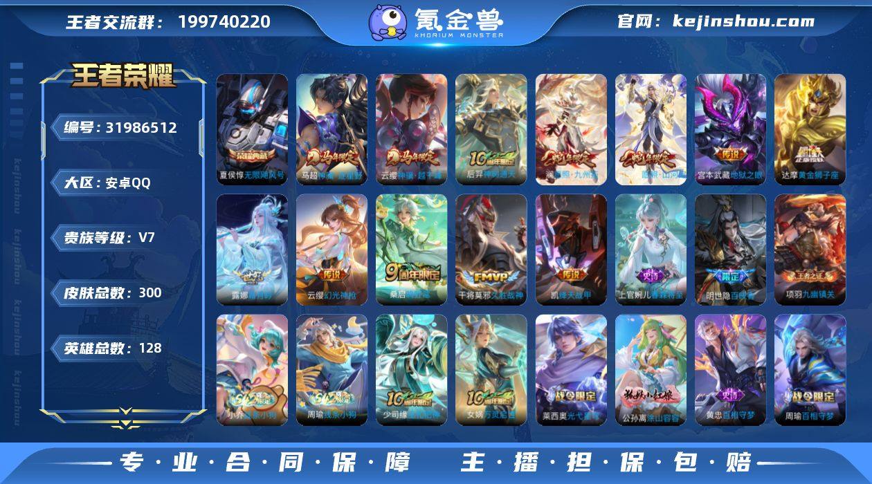 无二次安卓Q-V7-永恒钻石III段位-128英雄-300皮肤-1典藏皮肤-12传说-75史诗 【英雄全皮】:孙权全皮,敖隐全皮,司空震全皮,戈娅全皮,空空儿全皮,影全皮 【荣耀典藏】:夏侯惇无限飓风号 【传说皮肤】:云缨神骥越千峰,马超神骥逐星野,后羿神树通天,司空震愿照山河定,澜愿照九州拓,云缨幻光神枪,桑启鸣野蒿,露娜霜月吟,铠绛天战甲,干将莫邪久胜战神,达摩黄金狮子座,宫本武藏地狱之眼 【限定皮肤】:暃埋骨钱,蒙犽顽岩魄,大乔绒语心约,虞姬夏日便利店,姜子牙天穹之誓,杨戬破阵退雄兵,狄仁杰阴阳师,赵云皇家上将,元歌云间偶戏,元歌无心,狄仁杰魔术师,达摩沙漠行僧,项羽海滩派对,李元芳云中旅人,女娲朔望之晖,雅典娜单词大作战,鬼谷子五谷丰年,苏烈千军破阵,百里玄策原初追逐者,沈梦溪大漠名商,裴擒虎李小龙,裴擒虎擒涛扼浪,云中君纤云弄巧,嫦娥拒霜思,西施玲珑珍味,鲁班大师探海日志,桑启海盐诗旅,戈娅驭风魔法,艾琳流音漫舞,司空震地狱燃心,阿古朵江河有灵,张良古海寻踪,蒙犽百解令,高渐离燃音魔法,妲己灵卜魔法,鬼谷子天穹祈灯,姬小满妄想食味,沈梦溪龙舞盛年,鲁班七号蔬乡物语,李元芳蔬乡物语,刘邦剑破天穹,程咬金群星魔术团,刘备异域游侠,周瑜熔金海岸 【年限皮肤】:司空震愿照山河定,澜愿照九州拓 【赛季限定】:苏烈千军破阵,达摩沙漠行僧,沈梦溪大漠名商,李元芳云中旅人,桑启海盐诗旅,裴擒虎擒涛扼浪,鲁班大师探海日志,张良古海寻踪,鬼谷子天穹祈灯,刘邦剑破天穹,姜子牙天穹之誓,东皇太一噬灭天穹,太乙真人谧流熔炉,钟馗虚灵犬护,甄姬逆浪荇歌,亚瑟荣光之誓,百里玄策原初追逐者,项羽九幽镇关 【战令限定】:女娲朔望之晖,雅典娜单词大作战,元歌云间偶戏,戈娅驭风魔法,西施玲珑珍味,司空震地狱燃心,艾琳流音漫舞,高渐离...