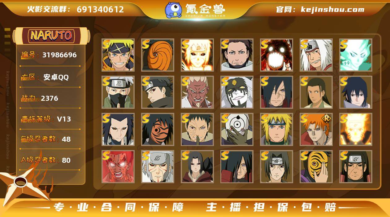 实名:不可二次实名 贵族等级:V13 战力值:29111094 S忍数:54 A忍数:77 五星猿飞日斩,五星自来也「仙人模式」,五星纲手,五星大蛇丸,四星烈斗「初代目风影」,四星波风水门,四星宇智波鼬「须佐能乎」,四星佩恩「天道」,四星自来也,三星漩涡鸣人·宇智波佐助,三星宇智波斑「五影会谈」,三星波风水门「九喇嘛连结」,三星漩涡鸣人「暴怒·第六尾」,三星自来也「传说中的三忍」,三星大筒木舍人「最终章」,三星旗木卡卡西「须佐能乎」,三星宇智波止水「须佐能乎」,三星艾「忍界大战」,三星大筒木桃式,三星宇智波斑「秽土转生·解」,三星千手柱间·木叶创立,三星宇智波佐助「永恒万花筒」,三星三代目风影「秽土转生」,三星神秘面具男「红夜之刃」,三星宇智波带土「忍界大战」,三星宇智波斑「白面具」,三星佩恩·天道「超」,三星漩涡鸣人「九喇嘛连结」,三星迈特凯「死门」,三星千手扉间「秽土转生」,三星宇智波鼬「秽土转生」,三星宇智波斑「秽土转生」,三星神秘面具男,三星千手柱间「秽土转生」,三星千手扉间,三星波风水门「秽土转生」,三星千手柱间,三星宇智波斑,三星猿飞日斩「秽土转生」,三星纲手「百豪」,三星药师兜「仙人模式」,三星罗砂「四代目风影」,三星宇智波斑「木叶创立」,三星半藏「秽土转生」,三星无「二代目土影」,三星长门「秽土转生」,三星鬼灯幻月「二代目水影」,三星大野木「忍界大战」,三星大野木「三代目土影」,三星艾「四代目雷影」,三星艾「三代目雷影」,三星春野樱「忍界大战」,三星大筒木金式「博人传」,三星自来也「舞之豪杰」 五星飞段「死司凭血」,五星飞段,五星蝎,五星干柿鬼鲛,五星猿飞阿斯玛,五星迈特凯,四星我爱罗「疾风传」,三星蝎「绯流琥」,三星漩涡博人「桃式显现」,三星宇智波止水,三星长门「青年」,三星艾「青年」,三星达鲁伊「五代目雷影」,三星波风水门「青年」,三星药师兜「半蛇斗篷」,三星小南,三星迪达拉,三星宇智波鼬,二星旗木卡卡西「神威对决」,二星小南「神驹佑将」,二星迈特凯「青春爆炸」,二星纲手「妖怪奇谭」,二星巳月「仙人模式」,二星大野木「侠隐江湖」,二星机械鸣人「初始形态」,二星土台「忍界大战」,二星黑土「夏日限定」,二星桃地再不斩「秽土转生」,二星神农「羁绊」,二星宇智波带土「漂泊浪客」,二星宇智波泉奈,二星不动,二星黑绝,二星角都「秽土转生」,二星李洛克「忍界大战」,二星旗木卡卡西「幻之真容」,二星日向雏田「最终章」,二星宇智波鼬「夏日限定」,二星小南「漂泊浪客」,二星日向宁次·忍界大战,二星不缘,二星长十郎「六代目水影」,二星不风,二星旗木卡卡西「元气夏日」,二星千手扉间「漂泊武士」,二星奇拉比「忍界大战」,二星宇智波止水「新春限定」,二星黑土「博人传」,二星宇智波佐助「须佐能乎」,二星加藤断,二星迪达拉「秽土转生」,二星小南「新春限定」,二星旗木卡卡西「忍界大战」,二星猿飞木叶丸「博人传」,二星照美冥「夏日泳装」,二星漩涡鸣人「九尾查克拉」,二星角都「晓创生」,二星千代「近松十人卫」,二星宇智波鼬「新春限定」,二星我爱罗「忍界大战」,二星秋道丁次「忍界大战」,二星大蛇丸「晓」,二星猿飞阿斯玛「秽土转生」,二星春野樱「百豪」,二星波风水门「新春限定」,二星照美冥「五代目水影」,二星勘九郎「忍界大战」,二星猿飞日斩「火影继承人」,二星宇智波佐助「万花筒写轮眼」,二星志村团藏,二星奇拉比,二星漩涡鸣人「仙人模式」,二星旗木卡卡西「万花筒写轮眼」,二星角都「地怨虞」,二星角都,二星桃地再不斩,二星卑留呼「火之意志继承者」 卖家说:全高招S A,