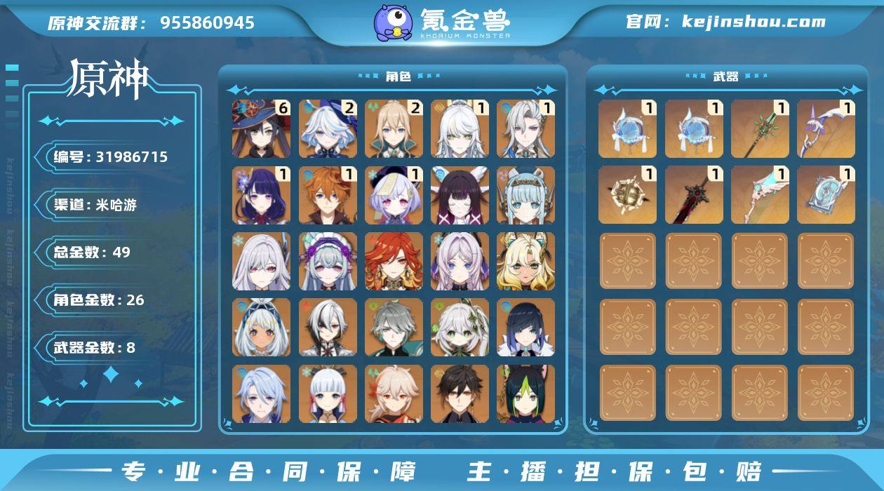 冒险等级:60 总黄数:49 5星角色数:26 5星武器数:8 原石数量:14067 纠缠之源数量:50 6命莫娜,2命芙宁娜,2命琴,1命兹白,1命那维莱特,1命雷电将军,1命达达利亚,1命七七,0命哥伦比娅,0命伊涅芙,0命丝柯克,0命梦见月瑞希,0命玛薇卡,0命茜特菈莉,0命希诺宁,0命玛拉妮,0命阿蕾奇诺,0命艾尔海森,0命纳西妲,0命夜兰,0命神里绫人,0命神里绫华,0命枫原万叶,0命钟离,0命提纳里,0命刻晴 6命班尼特,6命卡齐娜,6命赛索斯,6命行秋,6命北斗,6命迪奥娜,6命九条裟罗,6命坎蒂丝,6命罗莎莉亚,6命诺艾尔,6命砂糖,6命五郎,6命烟绯,6命瑶瑶,6命早柚,5命叶洛亚,5命菲谢尔,5命柯莱,5命莱依拉,4命爱诺,4命久岐忍,4命绮良良,4命多莉,4命丽莎,3命嘉明,3命安柏,3命珐露珊,3命雷泽,3命凝光,2命菲米尼,2命琳妮特,2命欧洛伦,2命香菱,2命夏洛蒂,2命夏沃蕾,2命芭芭拉,2命重云,2命辛焱,2命云堇,1命伊安珊,1命伊法,1命凯亚,1命卡维,1命鹿野院平藏,1命米卡,0命蓝砚,0命塔利雅,0命托马 精1帷间夜曲,精1和璞鸢,精1阿莫斯之弓,精1尘世之锁,精1狼的末路,精1天空之翼,精1四风原典 100%侦察骑士,古恩希尔德的传承,帆影游风,倩影游侠,岁夜欢哗,星与月之约,雨化竹身,叶隐芳名,致教会自由人 卖家说:号上有50个粉球和1万4原石,有月结晶,纳塔,龙王等主流配队,圣遗物还不错