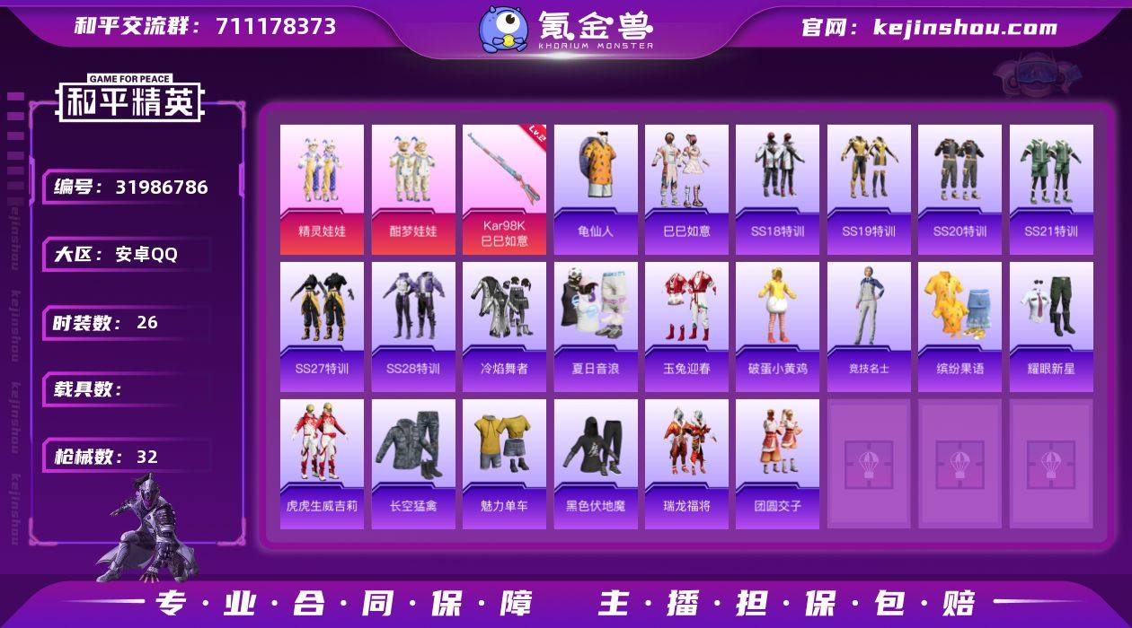 【ky360】安卓 手Q-2粉装-1特效枪-0载具-0粉色飞行器-9740热力值-1王牌印记-26套装-32枪皮 【热门品类】:套装-龟仙人 【粉色套装】:粉装-精灵娃娃,粉装-酣梦娃娃 【粉色枪皮等级】:Kar98K-巳巳如意(二级) 【粉色枪皮】:Kar98K-巳巳如意 【粉色降落伞】:青春物语降落伞,金丰海韵降落伞 【稀有套装】:套装-龟仙人,套装-巳巳如意 【稀有枪皮】:SCAR-L-玉兔迎春,M416-蓝色火焰,AUG-天降萌叽,AUG-耀粉歌者,M762-瑞龙福将,Mk47-洛神天依,UZI-天降萌叽,UZI-红色方程式,UMP45-蓝色火焰,Mini14-炫彩节奏,Mini14-甜心娃娃,Win94-瑞龙福将,S686-红色方程式,S1897-炫彩节奏,S12K-瑞龙福将,MG3-瑞龙福将,MG3-甜心娃娃 【其他套装】:套装-SS18特训,套装-SS19特训,套装-SS20特训,套装-SS21特训,套装-SS27特训,套装-SS28特训,套装-冷焰舞者,套装-夏日音浪,套装-玉兔迎春,套装-破蛋小黄鸡,套装-竞技名士,套装-缤纷果语,套装-耀眼新星,套装-虎虎生威吉莉,套装-长空猛禽,套装-魅力单车,套装-黑色伏地魔,套装-龟仙人,套装-瑞龙福将,套装-团圆交子 【营地ID】:938841970