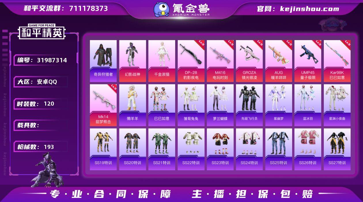 满级地铁 安卓 手Q-2粉装-9特效枪-0载具-1粉色飞行器-52716热力值-10王牌印记-120套装-193枪皮 【热门品类】:套装-奇异狩猎者 【粉色套装】:粉装-幻影战神,角色-千金淑猫 【粉色枪皮等级】:M416-电玩时刻(五级),GROZA-镜光银凌(五级),AUG-暖羊咩咩(五级),ACE32-萌骑漫游(四级),UMP45-量子极限(五级),Kar98K-巳巳如意(五级),Mk14-甜梦熊击(五级),Mk14-福马献瑞(五级),DP-28-豹影疾电(五级) 【粉色枪皮】:M416-电玩时刻,GROZA-镜光银凌,AUG-暖羊咩咩,ACE32-萌骑漫游,UMP45-量子极限,Kar98K-巳巳如意,Mk14-甜梦熊击,Mk14-福马献瑞,DP-28-豹影疾电 【粉色飞行器】:炫彩糖果飞行器 【粉色降落伞】:太空嘟嘟降落伞,闲梦青缨降落伞,忍者神龟降落伞,幻影飞狐降落伞,炫彩糖果降落伞 【稀有套装】:套装-巳巳如意,套装-雪国风尚,套装-炫彩糖果,套装-马上来财,套装-雏菊兔兔,套装-萝兰蝴蝶,套装-先驱飞行员,套装-紫幽梦,套装-蓝冰羽,套装-星渊小夜曲,玩偶服-懒羊羊,角色-曹焱兵 【稀有枪皮】:AUG-冰晶雪宝,AKM-彩虹符号,AKM-星之彼岸,AKM-破晓战魂,AKM-虎虎生威,AKM-龙的传人,M16A4-幻世战舞者,M16A4-甜心亚梦,SCAR-L-夜灯,SCAR-L-炫彩节奏,SCAR-L-玉兔迎春,SCAR-L-红色方程式,M416-糯团青竹,M416-红色方程式,M416-蓝色火焰,GROZA-彩虹符号,GROZA-田园牧歌,AUG-耀粉歌者,QBZ-飞驰魅影,M762-天降萌叽,M762-彩虹符号,AC-VAL-天降萌叽,AC-VAL-甜心亚梦,蜜獾-天降萌叽,蜜獾-娇憨猪猪,UZI-啾咪啾咪,UZI-天降萌叽,UZI-娇憨猪猪,UZI-炫彩节奏,UZI-红色方程式,UMP45-夜灯,UMP45-蓝色火焰,UMP45-绒宝小鹅,Vector-彩虹符号,Vector-生命誓言,Vector-田园牧歌,汤姆逊-天降萌叽,汤姆逊-炫彩节奏,汤姆逊-耀粉歌者,汤姆逊-智耀战神,P90-飞驰魅影,P90-巳巳...