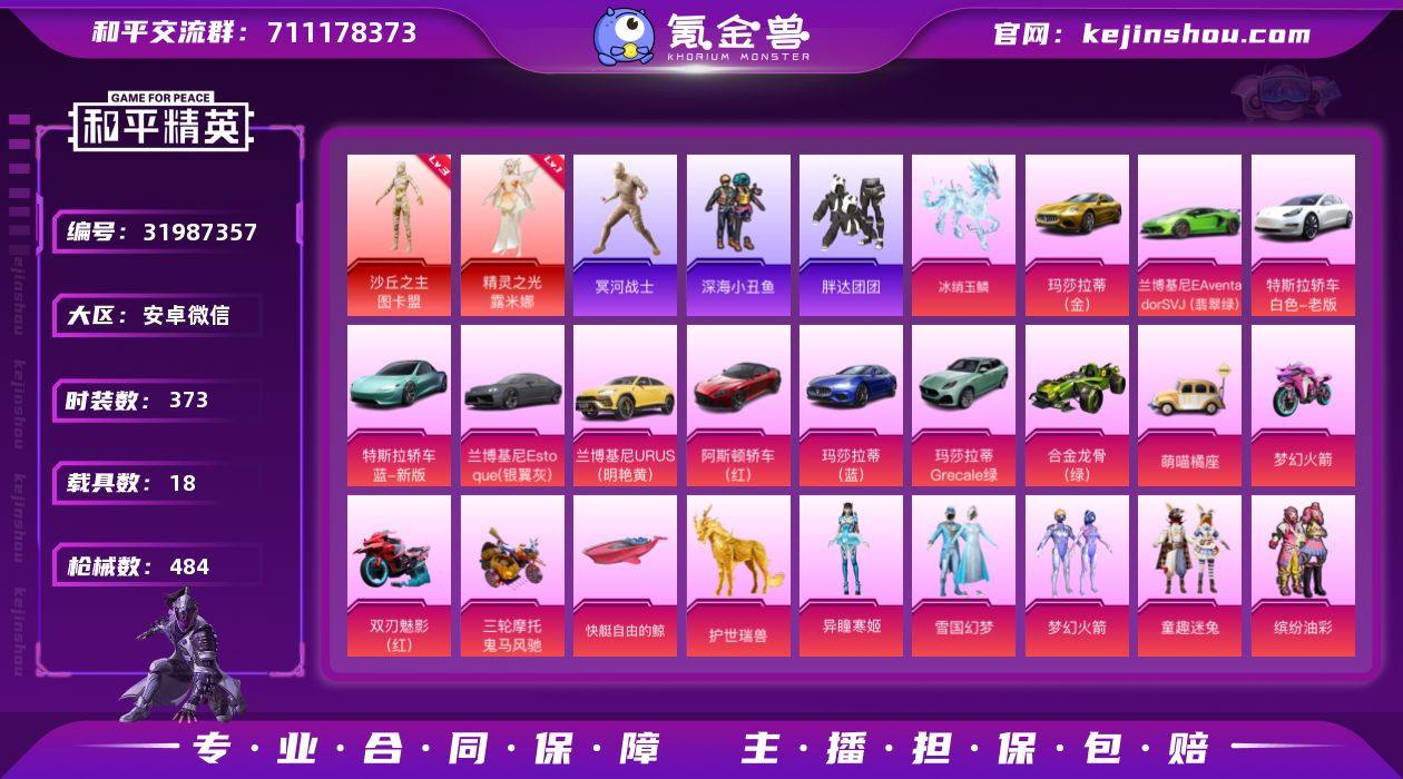 【特价出售/店主推荐】安卓 微信-2神装-41粉装-28特效枪-18载具-18粉色飞行器-20w热力值-23王牌印记-373套装-484枪皮 【红色神装等级】:精灵之光-露米娜(一级),沙丘之主-图卡盟(三级) 【红色角色神装】:精灵之光-露米娜,沙丘之主-图卡盟 【热门品类】:粉装-雪国幻梦,粉装-梦幻火箭,粉装-童趣迷兔,粉装-缤纷油彩,套装-浪漫天命,套装-冥河战士,套装-深海小丑鱼,角色-军刀雅典娜,套装-胖达团团,套装-金羽特工,套装-忍者信条,套装-SS1特训,套装-潮萌小黄鸭,套装-暗影哥特,套装-浪漫波比,套装-粉红小猪,熔岩游骑兵连帽夹克 【粉色套装】:粉装-宝贝奶油派,粉装-天使彩虹糖,粉装-金曜白虎,粉装-雪国幻梦,粉装-梦幻火箭,粉装-金属狂野,粉装-缤纷油彩,粉装-狩月元帅,粉装-向日葵,粉装-极致幻想,粉装-星空之魅,粉装-迷蝶贵族,粉装-冰霜白皇,粉装-童趣迷兔,粉装-炙焰红王,粉装-香水柠檬,粉装-绮梦青鸾,粉装-星之彼岸,粉装-馨动时刻,粉装-暗夜玫瑰,角色-闪耀迪迦,粉装-彩虹鹿灵,粉装-山涧鹿灵,粉装-齐天大圣,角色-洛天依,粉装-沙场疾风,粉装-吟月归客,角色-初号机款机体服,粉装-灵感创作师,粉装-鸾凤武仙,粉装-彩虹甜喵,粉装-霞光圣骑,粉装-寒光使者,粉装-未来歌姬,角色-猩猩队长,粉装-炫光之旅,角色-光极星,粉装-未来领航者,角色-女娲灵识,角色-智耀战神,角色-异瞳寒姬 【粉色枪皮等级】:AKM-甜心宝贝(七级),AKM-炫紫旋律(一级),AKM-梦之光华(七级),SCAR-L-童趣迷兔(一级),SCAR-L-机甲封神(七级),SCAR-L-金蛇镇世(三级),M416-五爪金龙(七级),M416-心之恋语(七级),M416-风花雪月(三级),GROZA-精灵之光(三级),AUG-星之彼岸(五级),AUG-暖羊咩咩(五级),M762-激战未来(二级),ARX-无垠阁(一级),UMP45-相思残雪(七级),P90-魔童闹海 敖丙(一级),Kar9...