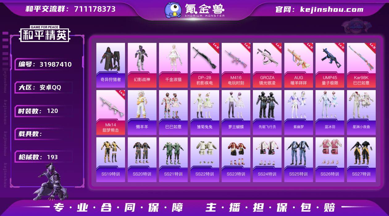满级地铁 安卓 手Q-2粉装-9特效枪-0载具-1粉色飞行器-52716热力值-10王牌印记-120套装-193枪皮 【热门品类】:套装-奇异狩猎者 【粉色套装】:粉装-幻影战神,角色-千金淑猫 【粉色枪皮等级】:M416-电玩时刻(五级),GROZA-镜光银凌(五级),AUG-暖羊咩咩(五级),ACE32-萌骑漫游(四级),UMP45-量子极限(五级),Kar98K-巳巳如意(五级),Mk14-甜梦熊击(五级),Mk14-福马献瑞(五级),DP-28-豹影疾电(五级) 【粉色枪皮】:M416-电玩时刻,GROZA-镜光银凌,AUG-暖羊咩咩,ACE32-萌骑漫游,UMP45-量子极限,Kar98K-巳巳如意,Mk14-甜梦熊击,Mk14-福马献瑞,DP-28-豹影疾电 【粉色飞行器】:炫彩糖果飞行器 【粉色降落伞】:太空嘟嘟降落伞,闲梦青缨降落伞,忍者神龟降落伞,幻影飞狐降落伞,炫彩糖果降落伞 【稀有套装】:套装-巳巳如意,套装-雪国风尚,套装-炫彩糖果,套装-马上来财,套装-雏菊兔兔,套装-萝兰蝴蝶,套装-先驱飞行员,套装-紫幽梦,套装-蓝冰羽,套装-星渊小夜曲,玩偶服-懒羊羊,角色-曹焱兵 【稀有枪皮】:AUG-冰晶雪宝,AKM-彩虹符号,AKM-星之彼岸,AKM-破晓战魂,AKM-虎虎生威,AKM-龙的传人,M16A4-幻世战舞者,M16A4-甜心亚梦,SCAR-L-夜灯,SCAR-L-炫彩节奏,SCAR-L-玉兔迎春,SCAR-L-红色方程式,M416-糯团青竹,M416-红色方程式,M416-蓝色火焰,GROZA-彩虹符号,GROZA-田园牧歌,AUG-耀粉歌者,QBZ-飞驰魅影,M762-天降萌叽,M762-彩虹符号,AC-VAL-天降萌叽,AC-VAL-甜心亚梦,蜜獾-天降萌叽,蜜獾-娇憨猪猪,UZI-啾咪啾咪,UZI-天降萌叽,UZI-娇憨猪猪,UZI-炫彩节奏,UZI-红色方程式,UMP45-夜灯,UMP45-蓝色火焰,UMP45-绒宝小鹅,Vector-彩虹符号,Vector-生命誓言,Vector-田园牧歌,汤姆逊-天降萌叽,汤姆逊-炫彩节奏,汤姆逊-耀粉歌者,汤姆逊-智耀战神,P90-飞驰魅影,P90-巳巳...