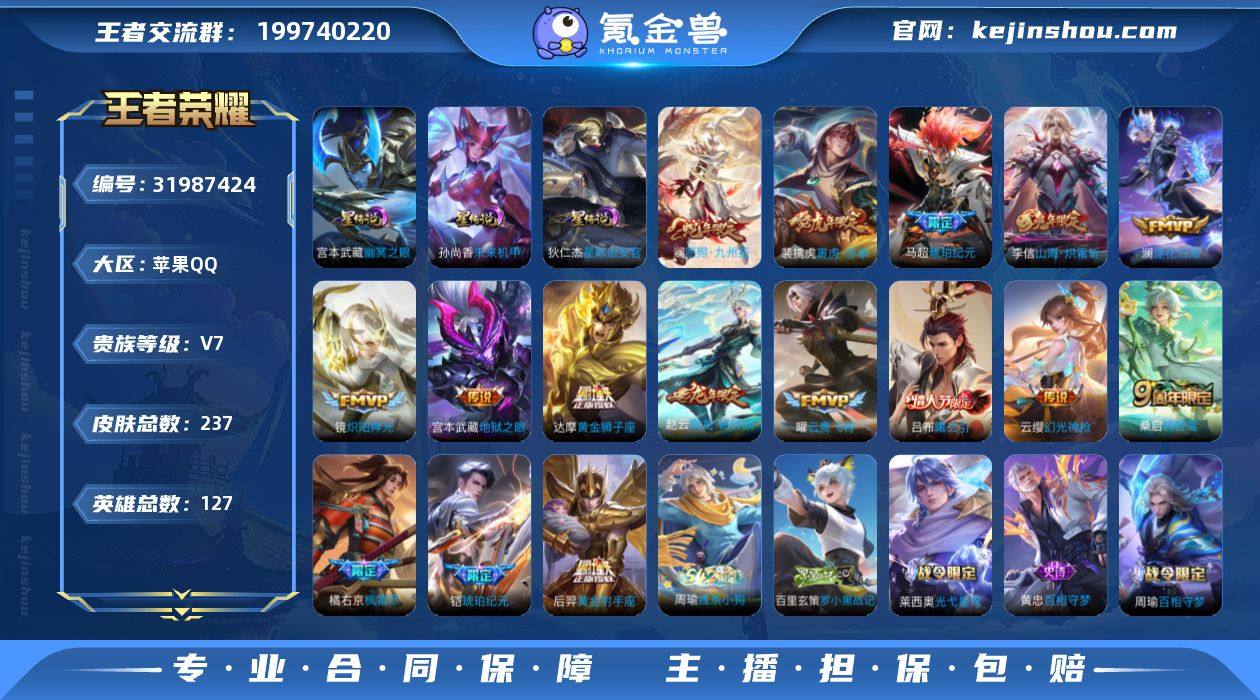 实名: 可修改 贵族等级: V7 英雄数: 127 皮肤数: 237 星传说: 未来机甲,幽冥之眼,星际治安官 传说皮: 黄金狮子座,黄金射手座,云鹰飞将,炽阳神光,地狱之眼,山海·炽霜斩,澜逐花归海,琥珀纪元铠,琥珀纪元马超,乘龙·铭钟鼎,吕布曦玄引,幻光神枪 限定皮: 梁祝,寅虎·赤拳,枫霜尽,五谷丰年,山海·玄木吟,鸣野蒿,愿照·九州拓