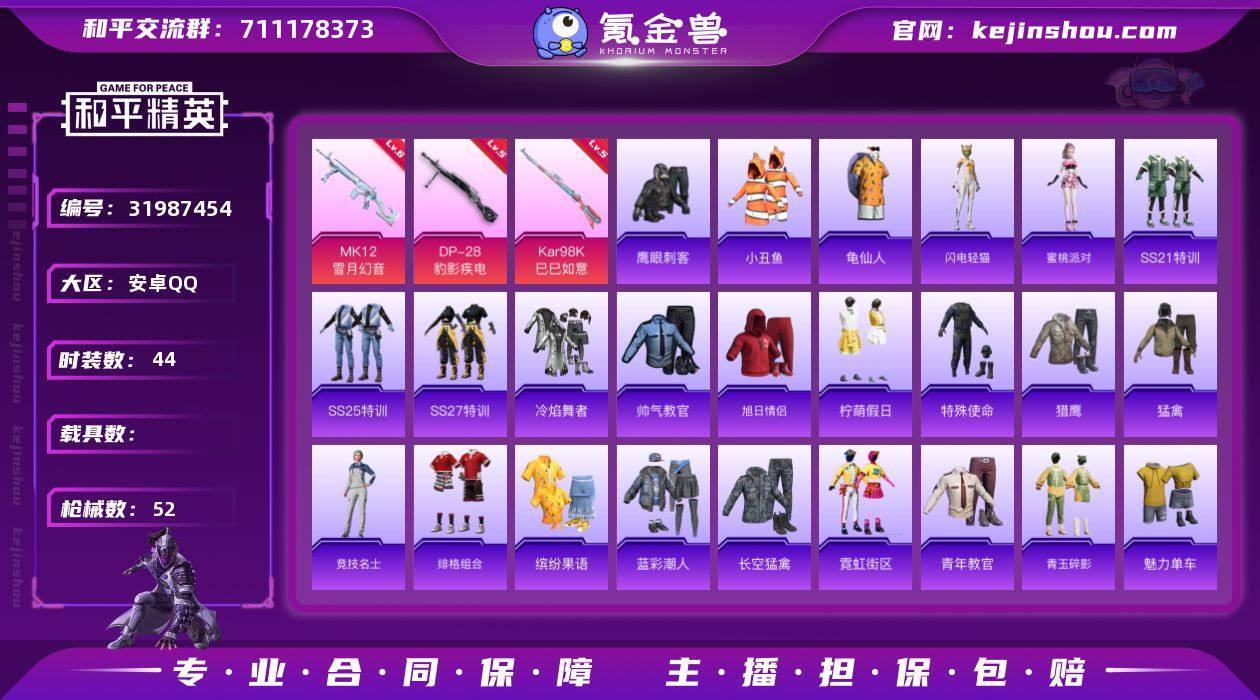安卓 手Q-0粉装-4特效枪-0载具-0粉色飞行器-15943热力值-1王牌印记-44套装-52枪皮 【热门品类】:套装-小丑鱼,套装-龟仙人 【粉色枪皮等级】:Kar98K-巳巳如意(五级),MK12-雪月幻音(六级),DP-28-豹影疾电(五级) 【粉色枪皮】:Kar98K-巳巳如意,Mk14-福马献瑞,MK12-雪月幻音,DP-28-豹影疾电 【粉色降落伞】:忍者神龟降落伞,星穹咏叹调降落伞,幻彩电音降落伞 【稀有套装】:套装-龟仙人,套装-马上有钱,套装-闪电轻猫,角色-蜜桃派对 【稀有枪皮】:AKM-破晓战魂,SCAR-L-炫彩节奏,SCAR-L-红色方程式,M416-糯团青竹,GROZA-影袭,AUG-天降萌叽,AUG-绝对恒星,QBZ-彩虹符号,M762-天降萌叽,蜜獾-天降萌叽,UMP45-生命誓言,UMP45-蓝色火焰,Vector-生命誓言,汤姆逊-奇异狩猎者,P90-巳巳如意,SKS-炫彩节奏,S686-生命誓言,S12K-玩趣呆呆,MG3-幻世战舞者 【其他套装】:套装-SS21特训,套装-SS25特训,套装-SS27特训,套装-冷焰舞者,套装-帅气教官,套装-旭日情侣,套装-柠萌假日,套装-特殊使命,套装-猎鹰,套装-猛禽,套装-竞技名士,套装-绯格组合,套装-缤纷果语,套装-蓝彩潮人,套装-长空猛禽,套装-霓虹街区,套装-青年教官,套装-青玉碎影,套装-魅力单车,套装-麻辣教官,套装-黄色名流,套装-黑色伏地魔,套装-龟仙人,套装-鹰眼刺客,套装-金耀舞者 【营地ID】:1037337672