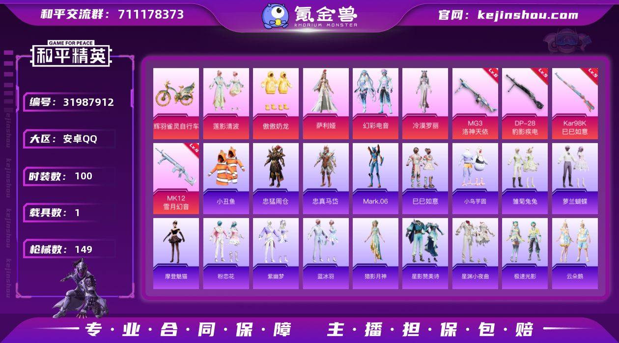 【1369】安卓 手Q-5粉装-4特效枪-1载具-5粉色飞行器-46171热力值-6王牌印记-100套装-149枪皮 【热门品类】:套装-小丑鱼,角色-忠猛周仓,角色-忠真马岱,角色-Mark.06,大砍刀-青龙偃月刀,撬棍-龙胆亮银枪 【粉色载具】:辉羽雀灵自行车 【粉色套装】:粉装-莲影清波,粉装-傲傲奶龙,角色-萨利娅,粉装-幻彩电音,角色-冷漠罗丽 【粉色枪皮等级】:Kar98K-巳巳如意(五级),MK12-雪月幻音(四级),DP-28-豹影疾电(五级),MG3-洛神天依(六级) 【粉色枪皮】:Kar98K-巳巳如意,MK12-雪月幻音,DP-28-豹影疾电,MG3-洛神天依 【粉色飞行器】:春暖花开飞行器,齐天大圣飞行器,繁龙极客飞行器,绯果甜心飞行器,终晖之翼飞行器 【粉色降落伞】:暗夜玫瑰降落伞,莲影清波降落伞,圣堂之誓降落伞,繁龙极客降落伞,精灵梦叶罗丽降落伞,精灵之光降落伞,智耀战神降落伞,湮灭星辰降落伞,时光之吻降落伞,双重狂想降落伞,最终圣卫者降落伞,冷漠罗丽降落伞,绯月迷踪降落伞 【稀有套装】:套装-巳巳如意,套装-小鸟芋圆,套装-雏菊兔兔,套装-萝兰蝴蝶,角色-摩登魅猫,套装-粉恋花,套装-紫幽梦,套装-蓝冰羽,角色-猎影月神,套装-星影赞美诗,套装-星渊小夜曲,套装-极速光影,套装-云朵鹅,套装-雪绒豹,套装-诡诞巡游,套装-混沌火种,角色-时希公主,角色-乐音 【稀有枪皮】:AKM-彩虹符号,AKM-生命誓言,AKM-破晓战魂,AKM-萌趣颜团子,AKM-虎虎生威,AKM-霓虹街区,AKM-龙的传人,M16A4-幻世战舞者,M16A4-红色方程式,M16A4-莲影清波,M16A4-最终圣卫者,SCAR-L-暗夜玫瑰,SCAR-L-炫彩节奏,SCAR-L-玉兔迎春,SCAR-L-红色方程式,SCAR-L-绯月迷踪,SCAR-L-冷漠罗丽,M416-神秘黑猫,M416-糯团青竹,M416-红色方程式,M416-蓝色火焰,GROZA-影袭,GROZA-恐龙拽拽,AUG-天降萌叽,AUG-耀粉歌者,AUG-金蛇镇...