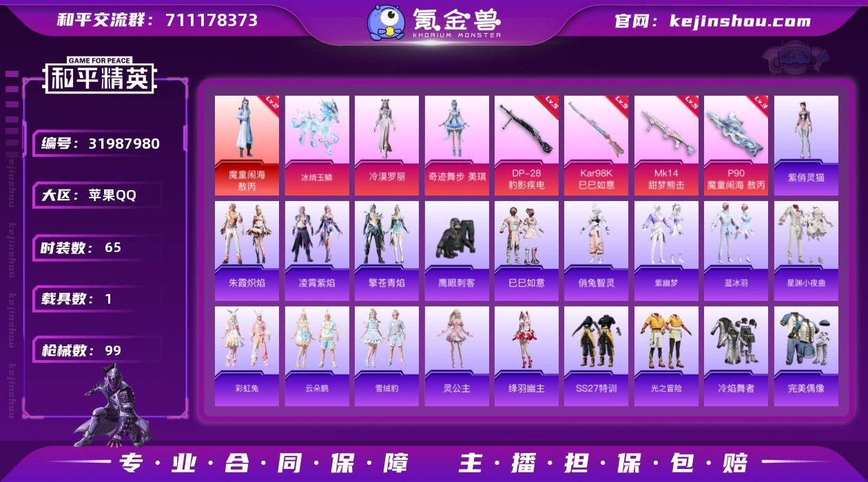 【ky438】苹果 手Q-1神装-3粉装-4特效枪-1载具-4粉色飞行器-31853热力值-3王牌印记-65套装-99枪皮 【红色神装等级】:魔童闹海-敖丙(二级) 【红色角色神装】:魔童闹海-敖丙 【热门品类】:套装-AG战队服 【粉色套装】:角色-冷漠罗丽,角色-奇迹舞步 美琪,角色-虹云熊熊 【粉色枪皮等级】:P90-魔童闹海 敖丙(三级),Kar98K-巳巳如意(五级),Mk14-甜梦熊击(五级),DP-28-豹影疾电(五级) 【粉色载具】:冰绡玉鳞 【粉色枪皮】:P90-魔童闹海 敖丙,Kar98K-巳巳如意,Mk14-甜梦熊击,DP-28-豹影疾电 【粉色飞行器】:炫彩糖果飞行器,终晖之翼飞行器,灵猫魔法师飞行器,灵珠游龙飞行器 【粉色降落伞】:最终圣卫者降落伞,桃源时光降落伞,绯穹魔姬降落伞,奇迹舞步降落伞,喜羊羊与灰太狼降落伞,魔童闹海 敖丙降落伞,异瞳寒姬降落伞,炫彩糖果降落伞 【稀有套装】:套装-巳巳如意,套装-马上有钱,角色-俏兔智灵,套装-紫幽梦,套装-蓝冰羽,套装-星渊小夜曲,套装-彩虹兔,套装-云朵鹅,套装-雪绒豹,角色-灵公主,角色-绛羽幽主,套装-朱霞炽焰,套装-凌霄紫焰,套装-擎苍青焰,角色-紫俏灵猫 【稀有枪皮】:AUG-冰晶雪宝,AKM-江南烟雨,AKM-灵猫魔法师,SCAR-L-炫彩节奏,M762-第五大道,M762-云朵鹅,G36C-星穹咏叹调,蜜獾-天降萌叽,蜜獾-虎痴许褚,蜜獾-绯穹魔姬,ARX-凌霄紫焰,UZI-啾咪啾咪,UZI-桃源时光,UMP45-夜灯,汤姆逊-天降萌叽,野牛-最终圣卫者,JS9-凌霄紫焰,P90-巳巳如意,Kar98k-最终圣卫者,AWM-奇迹舞步,Mini14-耀粉歌者,Mini14-绯穹魔姬,SVD-云朵鹅,S686-生命誓言,S686-巳巳如意,S12K-夜灯,DBS-幻彩电音,SPAS-12-云朵鹅,M249-绯穹魔姬,DP-28-彩虹符号,MG3-幻世战舞者,MG-36-凌霄紫焰,P92-凌霄紫焰,R45-幻彩电音,沙漠之鹰-云朵鹅,大砍刀-云朵鹅,撬棍-灵猫魔法师,...