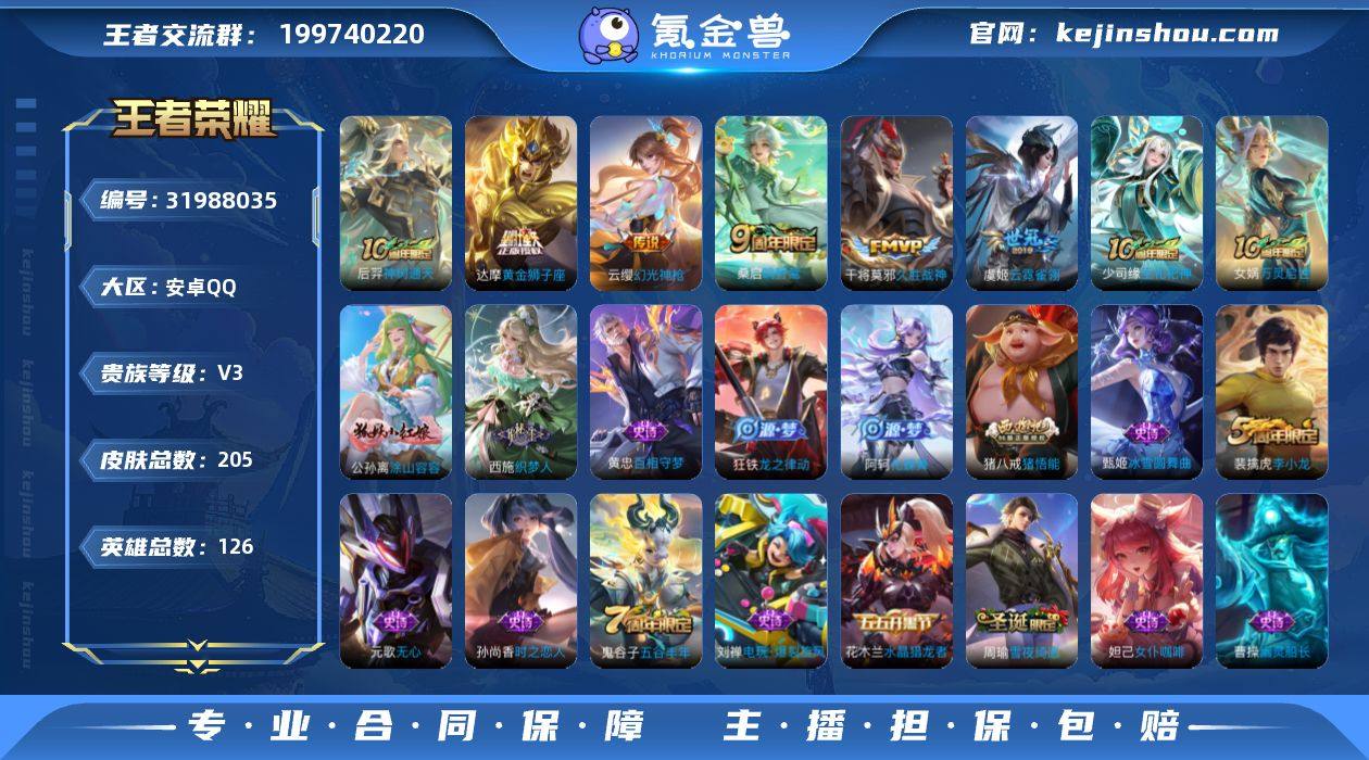 安卓Q-V3-永恒钻石I段位-126英雄-205皮肤-6传说-52史诗 【传说皮肤】:后羿神树通天,云缨幻光神枪,桑启鸣野蒿,干将莫邪久胜战神,虞姬云霓雀翎,达摩黄金狮子座 【限定皮肤】:姜子牙天穹之誓,杨戬破阵退雄兵,狄仁杰阴阳师,孙尚香蔷薇恋人,元歌无心,狄仁杰万华元夜,达摩沙漠行僧,老夫子醍醐杖,程咬金演武夺筹,兰陵王金庭之子,牛魔御旌,李元芳云中旅人,钟馗驱傩正仪,干将莫邪胡桃夹子,鬼谷子原初探秘者,鬼谷子五谷丰年,苏烈千军破阵,弈星混沌棋,沈梦溪大漠名商,明世隐疑决卦,裴擒虎李小龙,裴擒虎擒涛扼浪,盾山御銮,猪八戒猪悟能,上官婉儿梁祝,鲁班大师探海日志,桑启海盐诗旅,阿古朵江河有灵,张良古海寻踪,鬼谷子天穹祈灯,沈梦溪龙舞盛年,刘邦剑破天穹,程咬金群星魔术团,周瑜熔金海岸 【赛季限定】:牛魔御旌,盾山御銮,弈星混沌棋,明世隐疑决卦,老夫子醍醐杖,鬼谷子原初探秘者,狄仁杰万华元夜,程咬金演武夺筹,钟馗驱傩正仪,苏烈千军破阵,达摩沙漠行僧,兰陵王金庭之子,沈梦溪大漠名商,李元芳云中旅人,桑启海盐诗旅,裴擒虎擒涛扼浪,鲁班大师探海日志,张良古海寻踪,鬼谷子天穹祈灯,刘邦剑破天穹,姜子牙天穹之誓,东皇太一噬灭天穹,太乙真人谧流熔炉,钟馗虚灵犬护,甄姬逆浪荇歌,亚瑟荣光之誓 【史诗皮肤】:少司缘巫礼祀神,女娲万灵启世,公孙离涂山容容,西施织梦人,黄忠百相守梦,狂铁龙之律动,阿轲化蝶舞,弈星万物之道,周瑜雪夜绮愿,阿古朵江河有灵,刘禅电玩爆裂旋风,元歌无心,鬼谷子五谷丰年,猪八戒猪悟能,沈梦溪月团寄思,裴擒虎李小龙,孙尚香时之恋人,上官婉儿梁祝,狄仁杰鹰眼统帅,孙策猫狗日记,阿轲节奏热浪,白起星夜王子,程咬金功夫厨神,李元芳逐浪之夏,刘禅天才门将,蔡文姬舞动绿茵,百里守约特工魅影,安琪拉心灵骇客,诸...