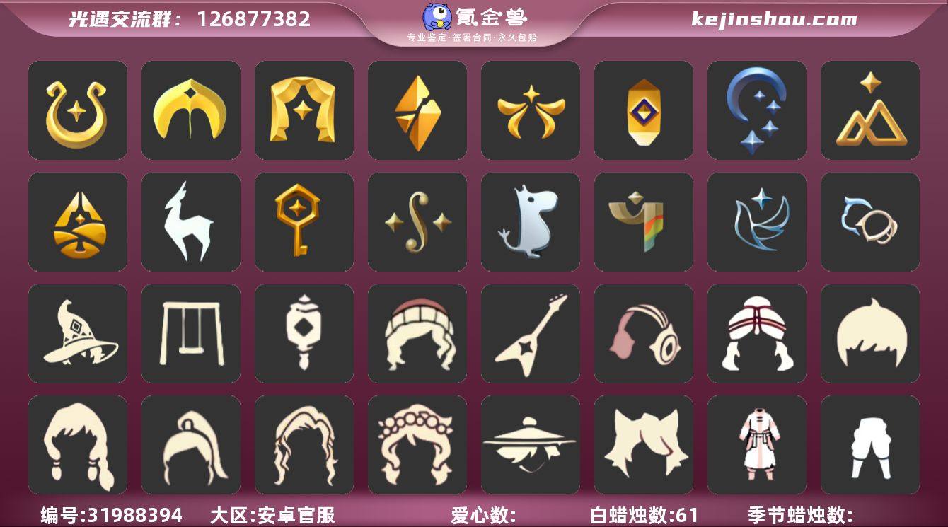 6季耳坠白枭多礼多复刻 悦动跑鞋 瑞气服饰 暗彩服饰 园丁服饰 KFC 彩虹帽 蝙蝠套 巫师帽 绊爱套 青衫落拓 飞蛾斗 星月王冠 彩虹耳坠 彩虹耳机 女巫犄角 tgc 铜钱斗 海龟斗 皮皮猫斗 粽叶斗 欧若拉之声 瑞气阳伞 中秋灯笼 折扇 秋千 野餐垫 音乐桌 绊爱电视机 翼数量:128 季卡数:19 资源:蜡烛:61 爱心:113 红蜡:6 已毕业地图:晨岛 云野 雨林 霞谷 墓土 禁阁 毕业季节:魔法季 圣岛季 表演季 破晓季 欧若拉季 追忆季 夜行季 拾光季 归巢季 九色鹿季 筑巢季 二重奏季 姆明季 彩染季 青鸟季 双星季 热门礼包:悦动跑鞋 瑞气服饰 暗彩服饰 园丁服饰 KFC 彩虹帽 蝙蝠套 巫师帽 绊爱套 青衫落拓 飞蛾斗 星月王冠 彩虹耳坠 彩虹耳机 女巫犄角 tgc 铜钱斗 海龟斗 皮皮猫斗 粽叶斗 欧若拉之声 瑞气阳伞 中秋灯笼 折扇 秋千 野餐垫 音乐桌 绊爱电视机 热门复刻:背带裤 彩虹链带 人字拖 白棉裤 毛靴棉裤 工装裤 灯笼裤 紧身棉裤 工装裤 连体衣 武士裤 白毛绒裤 击剑连体衣 过膝长袍 小丑睡衣 狐狸面具 鼬鼠面具 老爷爷面具 修行面具 玫瑰花面具 兔子尾巴 圣诞铃铛 斗笠 蝴蝶结发型 公主头 粗辫 书虫 总裁头 正太 高马尾 明制帽 郡主 箬笠 花环 虚荣 平顶帽 猫猫头 半扎马尾 圆环发辫 樱花发型 猫耳发型 单片羽毛 花环发饰 红耳机 断角发饰 飘带耳坠 兰花斗 荧蓝斗 幽兰斗 红金斗 黑金斗 白金斗 蔚紫斗 羽翼斗 道袍 飞鸟斗 小浣熊斗 花羽斗 绿芽斗 海浪斗 彩虹斗 暗彩斗 圣诞斗 电吉他 冥龙号角 雨伞 星星灯 女巫茶桌 ,晨岛,云野,雨林,霞谷,暮土,禁阁