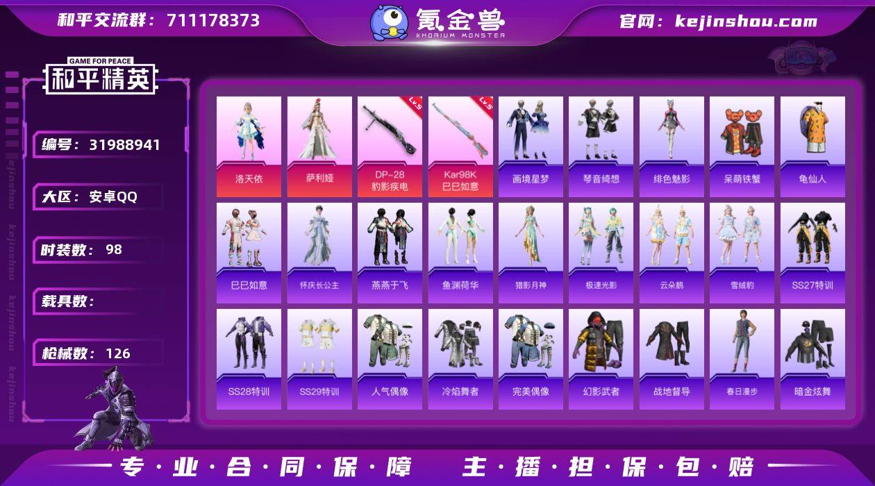 安卓 手Q-2粉装-3特效枪-0载具-3粉色飞行器-35227热力值-6王牌印记-98套装-126枪皮 【热门品类】:套装-龟仙人 【粉色套装】:角色-洛天依,角色-萨利娅 【粉色枪皮等级】:Kar98K-巳巳如意(五级),Mk14-福马献瑞(五级),DP-28-豹影疾电(五级) 【粉色枪皮】:Kar98K-巳巳如意,Mk14-福马献瑞,DP-28-豹影疾电 【粉色飞行器】:炫彩糖果飞行器,彩虹独角兽飞行器,戏水时光飞行器 【粉色降落伞】:洛神天依降落伞,千面幻镜降落伞,电糖天使降落伞,未来领航者降落伞,月下星之子降落伞,樱桃泡泡降落伞,墨金战记降落伞,星穹咏叹调降落伞,辉羽雀灵降落伞,喜羊羊与灰太狼降落伞,异瞳寒姬降落伞,炫彩糖果降落伞 【稀有套装】:套装-龟仙人,套装-巳巳如意,套装-雪国风尚,套装-炫彩糖果,套装-马上来财,角色-怀庆长公主,套装-燕燕于飞,套装-鱼渊荷华,角色-猎影月神,套装-极速光影,套装-云朵鹅,套装-雪绒豹,角色-绯色魅影,套装-画境星梦,套装-琴音绮想,角色-碧青流霞,角色-幽雨猫猫 【稀有枪皮】:AKM-破晓战魂,M16A4-红色方程式,M16A4-蓝色火焰,SCAR-L-夜灯,SCAR-L-炫彩节奏,SCAR-L-红色方程式,M416-糯团青竹,M416-红色方程式,M416-蓝色火焰,AUG-耀粉歌者,M762-彩虹符号,M762-云朵鹅,Mk47-炫光之旅,G36C-星穹咏叹调,蜜獾-天降萌叽,ACE32-画境星梦,UZI-啾咪啾咪,UZI-天降萌叽,UZI-红色方程式,UMP45-夜灯,UMP45-电音之王,UMP45-蓝色火焰,Vector-焰鹰斗篷,Vector-创世·救赎,汤姆逊-天降萌叽,汤姆逊-炫彩节奏,汤姆逊-耀粉歌者,MP5K-画境星梦,P90-巳巳如意,Kar98K-红色方程式,M24-炫彩节奏,M24-幻彩电音,AWM-焰鹰斗篷,Mini14-耀粉歌者,SVD-云朵鹅,M1加兰德-画境星梦,S686-生命誓言,S686-红色方程式,S1897-炫彩节奏,S12K-破晓战魂,S12K-夜灯,S12K-智耀战神,D...