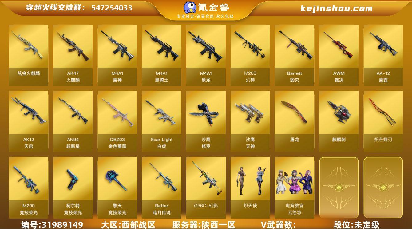 8269/西部/陕西一区/可排位/75v/传说幽瞳/*2/幻神/幻神丹凤/【200竞技荣光套装/200竞技荣光/科柯尔特竞技荣光/擎天竞技荣光/】/QBZ金色蔷薇/金色蔷薇破浪逐光/白虎/白虎暗星/王者白虎/觉醒版/G36C幻影/幻影破浪逐光/炽芒碟刃/【四防角色】/电竞教官云悠悠/【角色】/研/不败狙神/战地猎狐/葵阿尔法武装/蛇隐宗/雪域霜狐/【音效卡】/死神怀旧音效卡/黑骑士音效卡/雷神音效卡/昌龙怀旧音效卡/炼狱百战金芒音效卡/毁灭音效卡/沙鹰修罗音效卡/【枪皮】/雷神CFPLS18冠军/火麒麟巅峰荣耀/屠龙破光逐浪/雷神化蛇/【王者】/王者冰魄/王者蔷薇/【炫金】/炫金火麒麟/*2/【小人枪】/朱雀蛇隐宗/水枪不败狙神/裁决雪莉杨/马枪/KAC锯式机枪黑桃战神/巴雷特赏金猎人/*2/永久AC/找回包赔